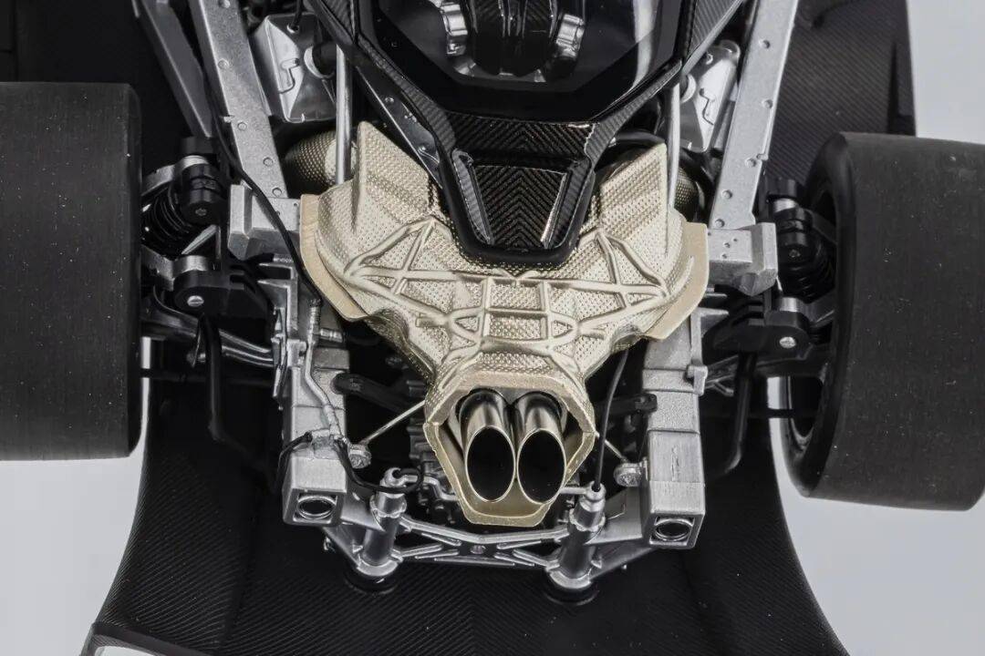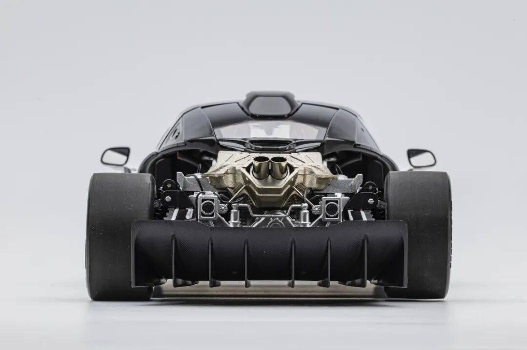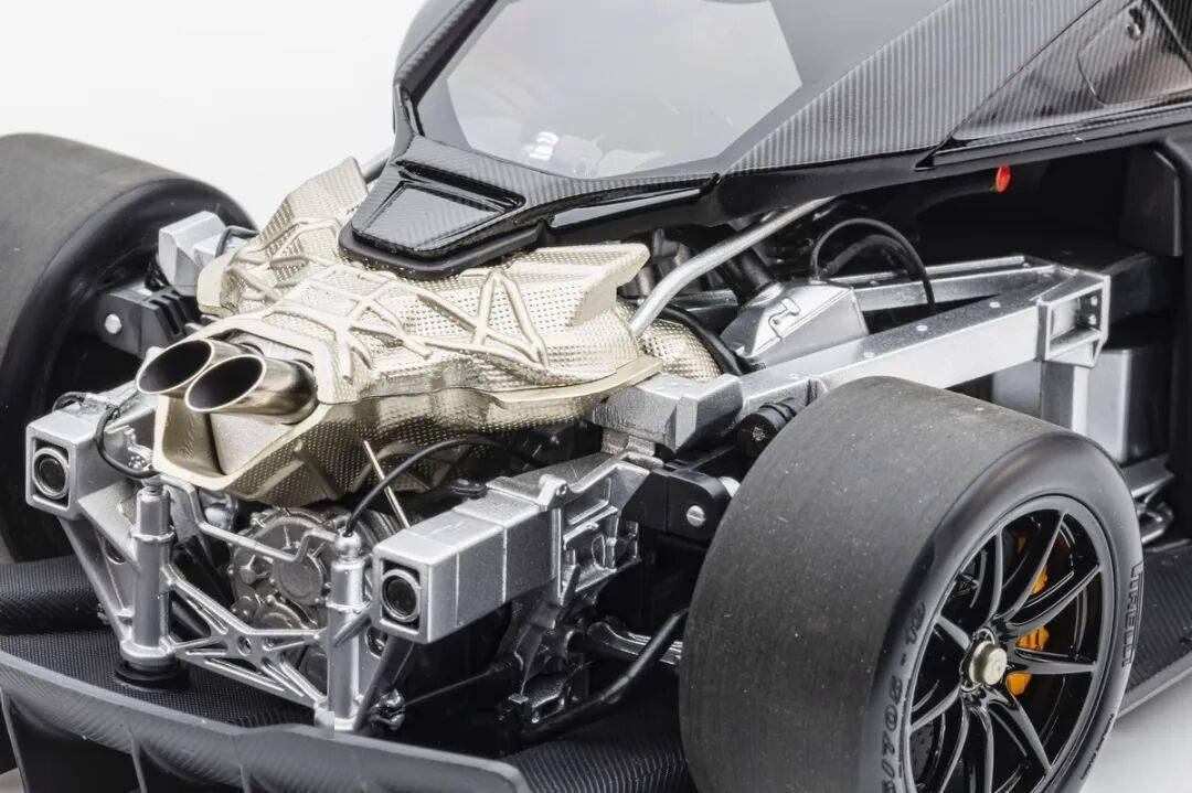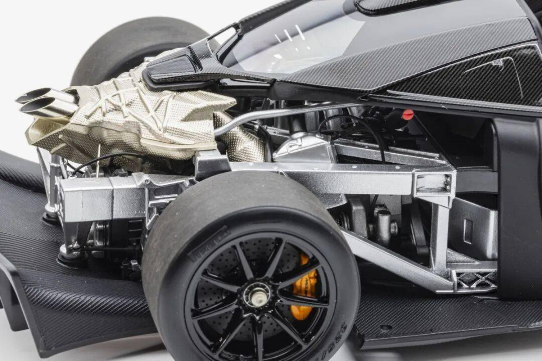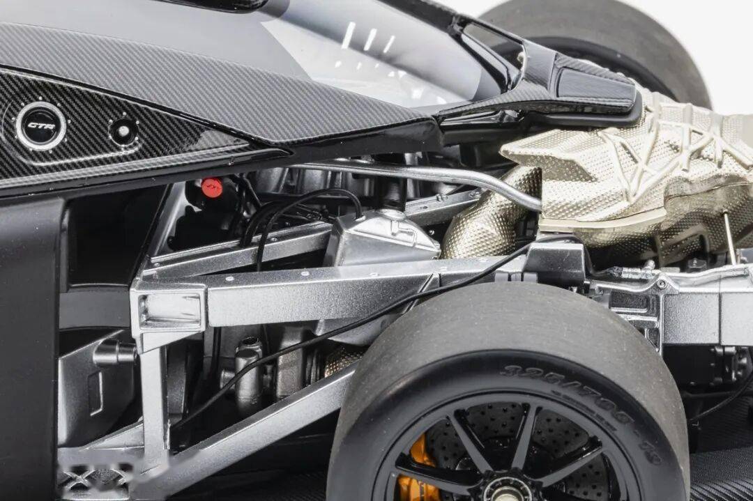 模型的后車身蓋子可以整體取出,取出后可以觀察到整個發動機、排氣系統和懸掛系統結構,LCD這款SENNA GTR模型的懸掛結構式真實還原兼可動的。不過發動機整體質感偏塑料,這點上和之前的HUAYRA R有一定差距,不過金屬的排氣管質感確實不錯。