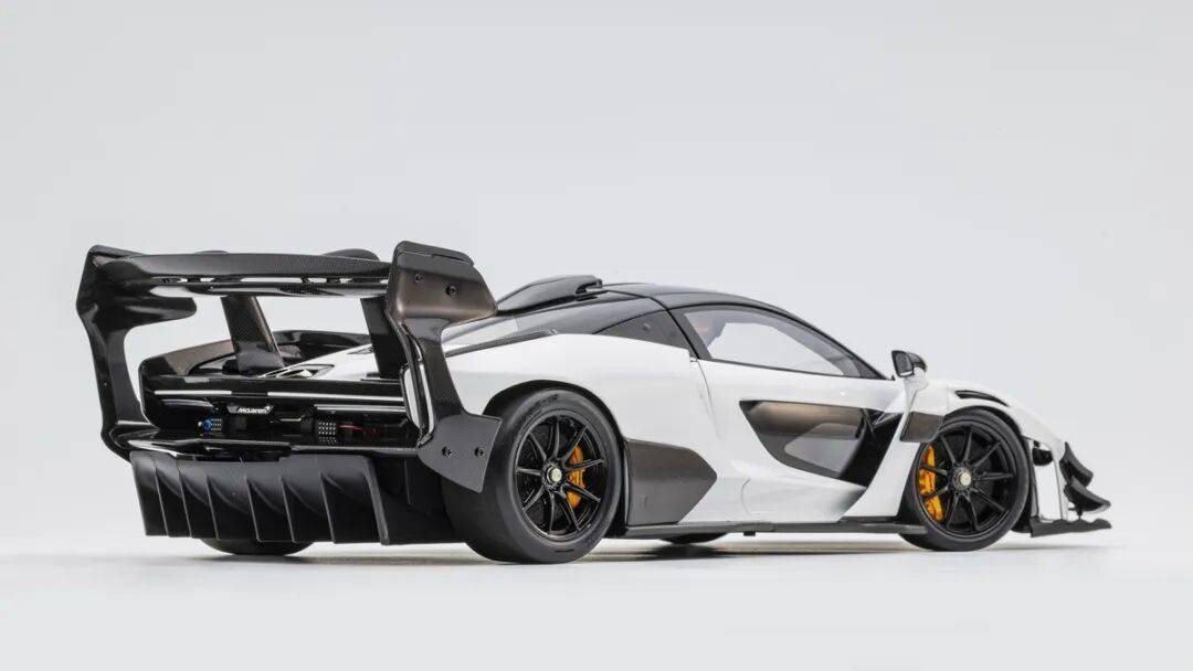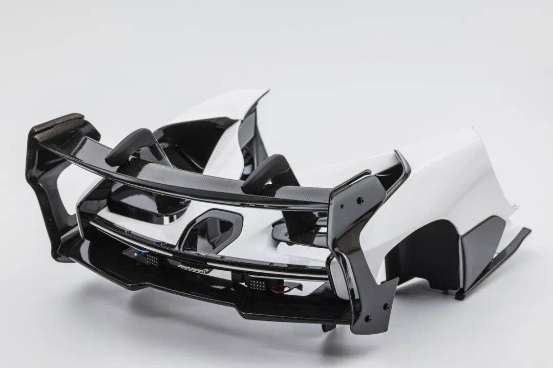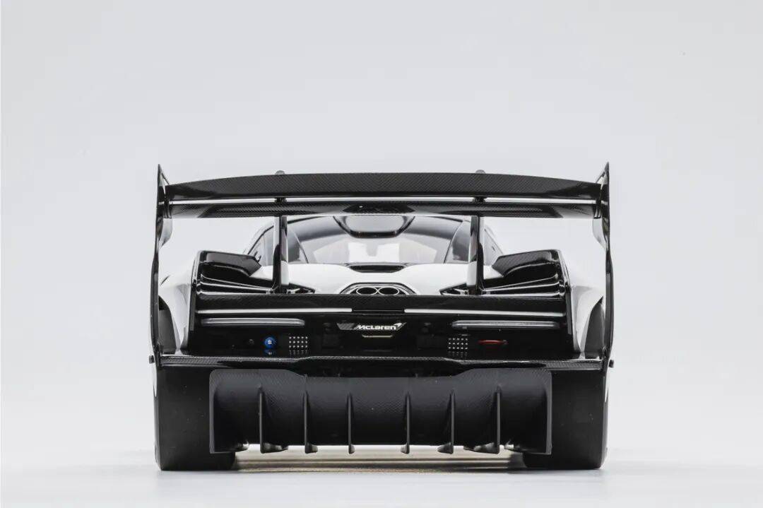 SENNA GTR的車尾有較大面積的通風設計,尾燈旁邊的通風口也是真實鏤空的。兩出的排氣管采用獨立件金屬件,位置放在SENNA GTR的后蓋后側。車尾有賽車的后警示燈,還有支撐起車身(用于換輪胎)的充氣口。車尾有多層尾翼,而且都是覆蓋了碳纖維的,還有紅色的拖車環,這個也是金屬材質的。車尾的MCLAREN標志為懸空結構,標志為金屬蝕刻片。尾部擴散器風刀還原度較高,尾翼的結構復雜,還原度也比較高。SENNA GTR有超級夸張的尾翼,尾翼整體都是用碳纖維貼紙覆蓋的,而且還原了復雜的多層結構,尾翼的支架也還原到位,兩側還有金屬材質的尾翼側風刀,這個風刀一直連接到車身上。