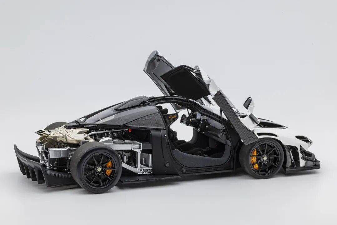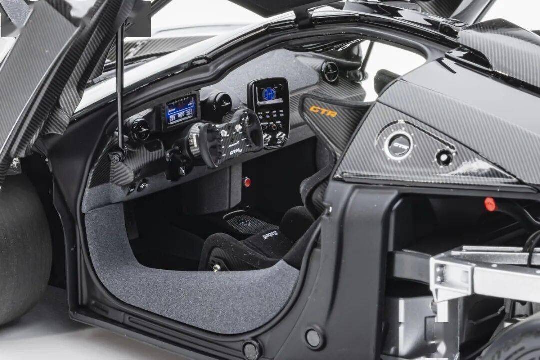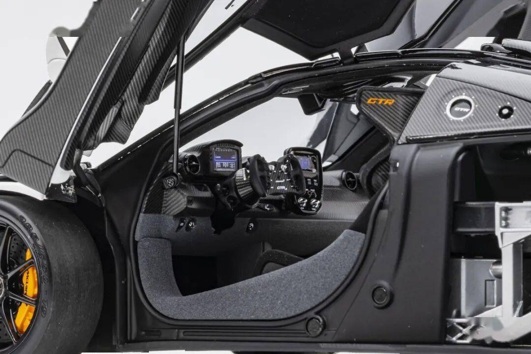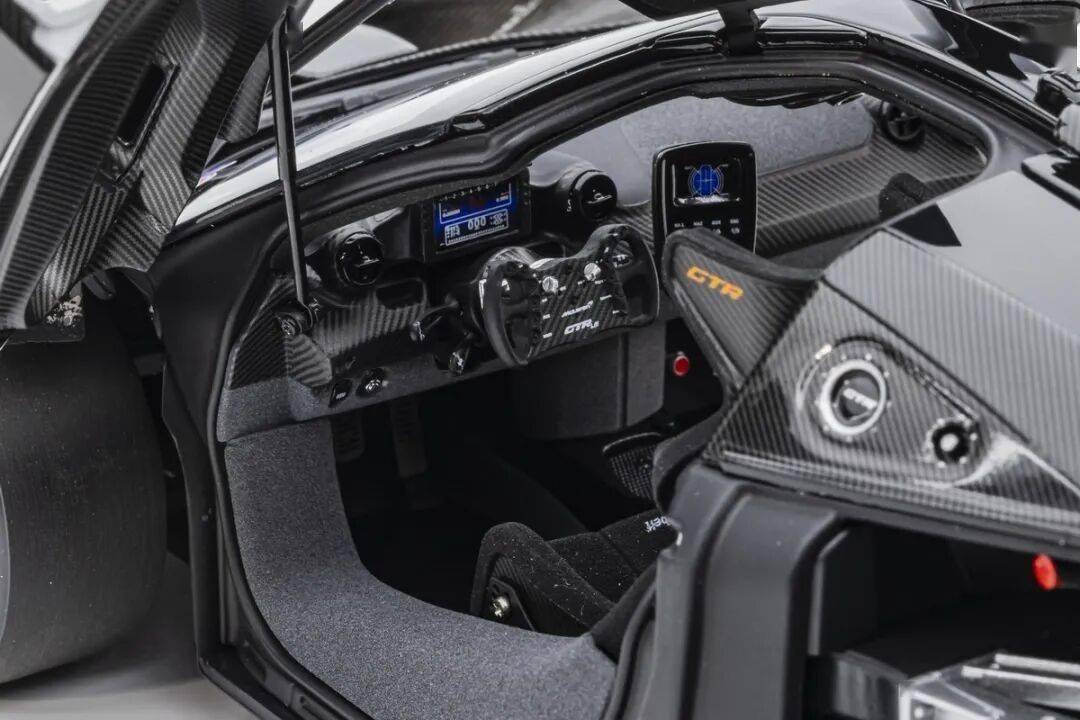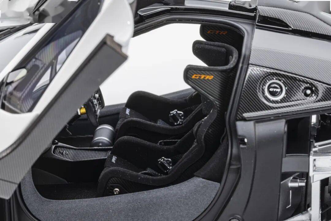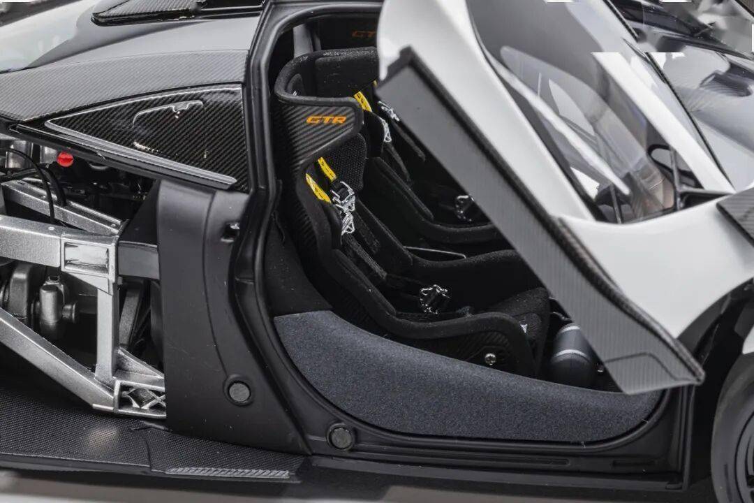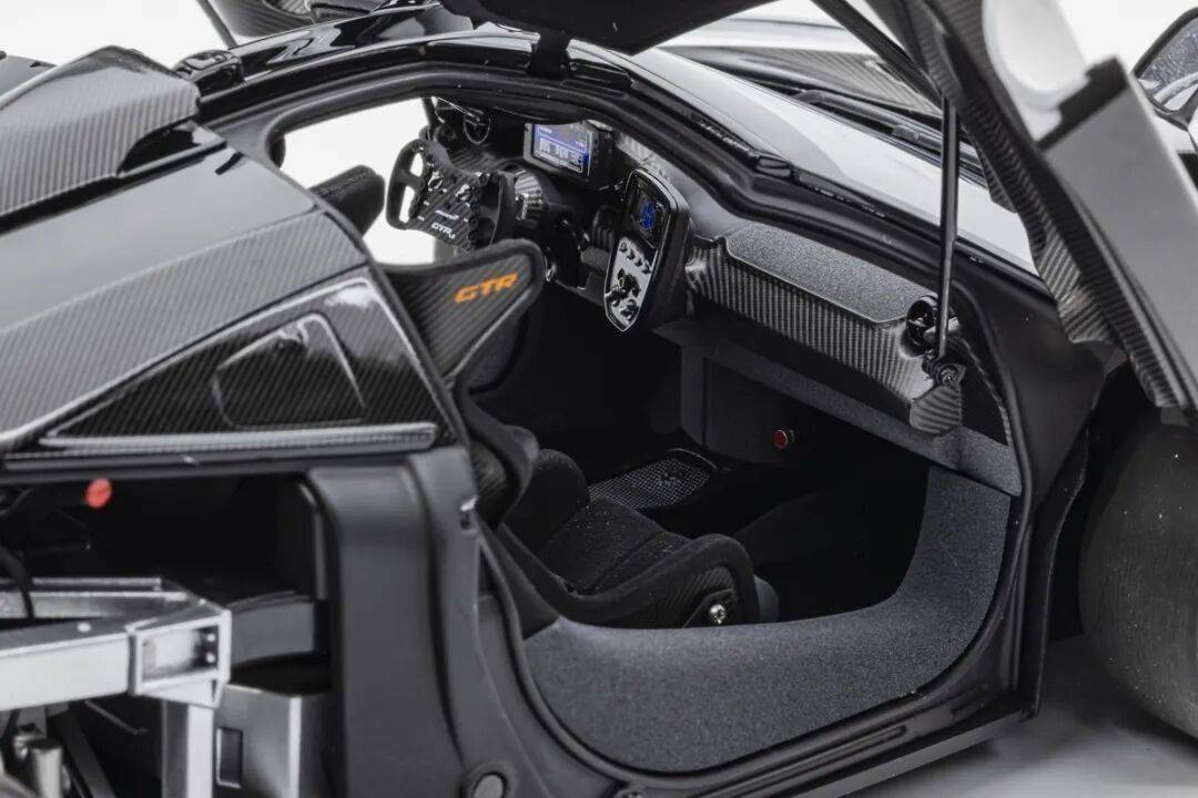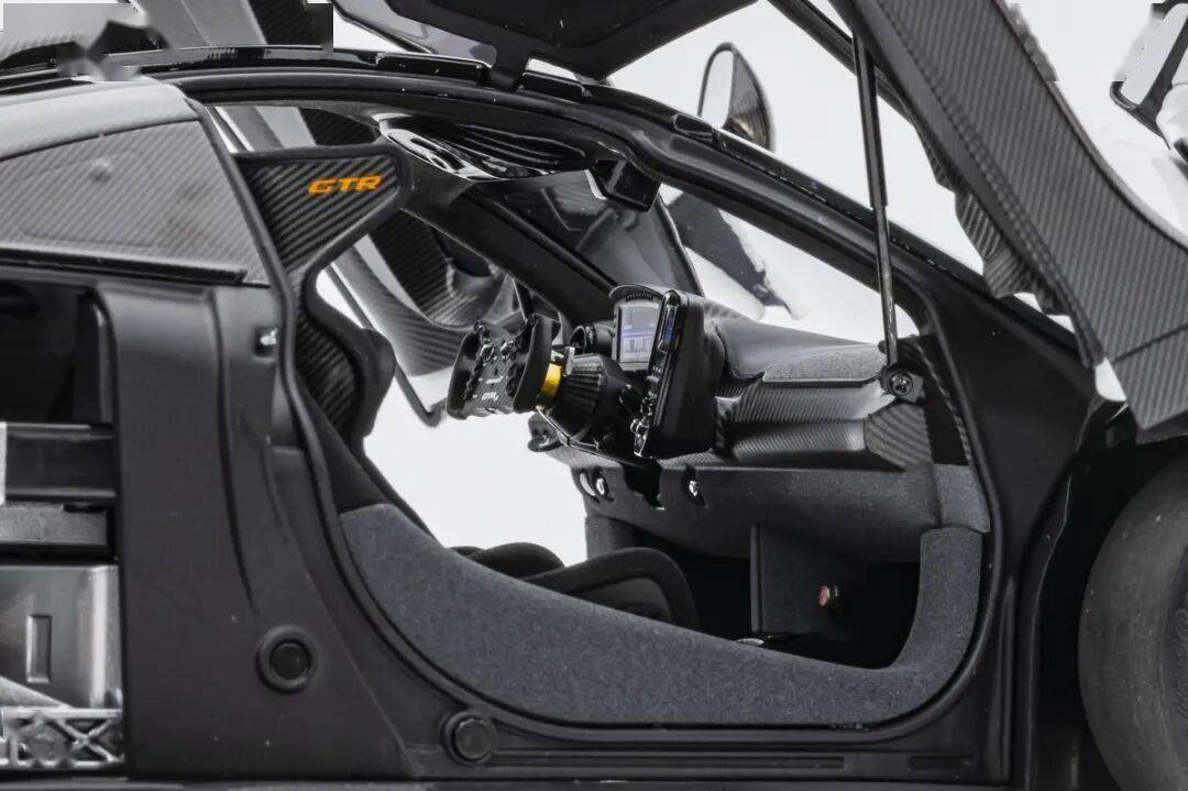 SENNA GTR基本上就是一款賽車,有很多賽車專用的細節,模型還有還原四點安全帶。座椅后方應該是整體貼碳纖維貼紙的,整個駕駛艙基本都是覆蓋了碳纖維貼紙,做工非常用心,駕駛艙地板貌似也是做了植絨的,乘客座椅前還有滅火筒,這個位置估計也不會坐人。模型的車門為蝴蝶門,開啟角度還行,內部也是覆蓋了碳纖維的。