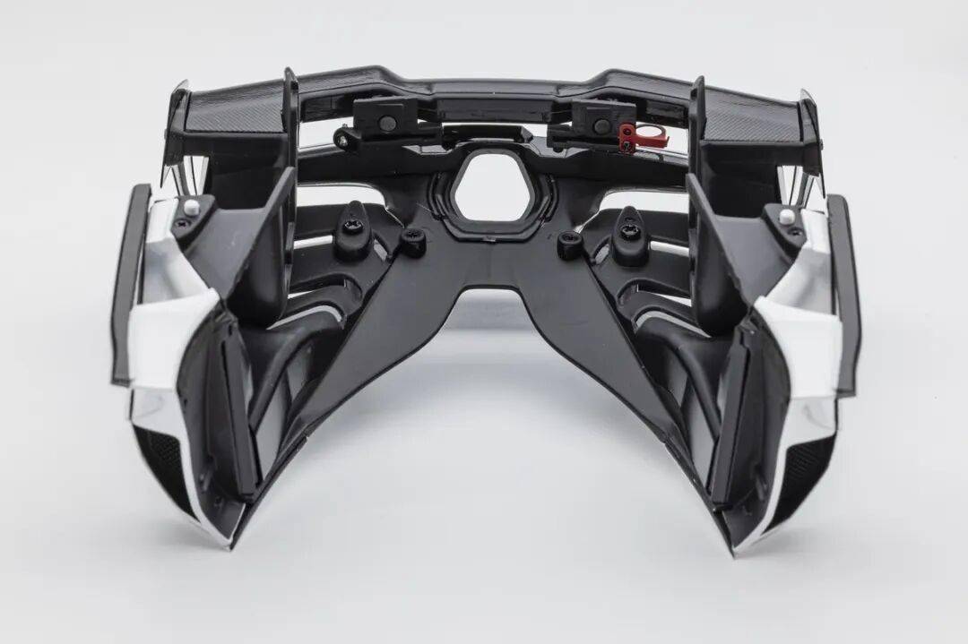 模型的后蓋結構更為復雜,通風口也都是真實鏤空的,還有風扇細節刻畫。尾翼橫翼結構復雜,模型還原度也很高,細節很豐富。后蓋內側也是全部覆蓋碳纖維貼紙,同樣是左右對稱的。