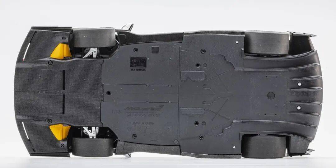 模型的底盤采用表面成形的碳纖維紋路,這里也是左右對稱的,模型的前唇和車頭位置用了碳纖維貼紙,還可以看到黃色的導風片。除了一些風刀和浮雕的通風口外之外,也沒有其他細節,不過估計真車也是這個情況,模型也還原了光頭胎細節,而且廠家還對輪胎進行打磨。