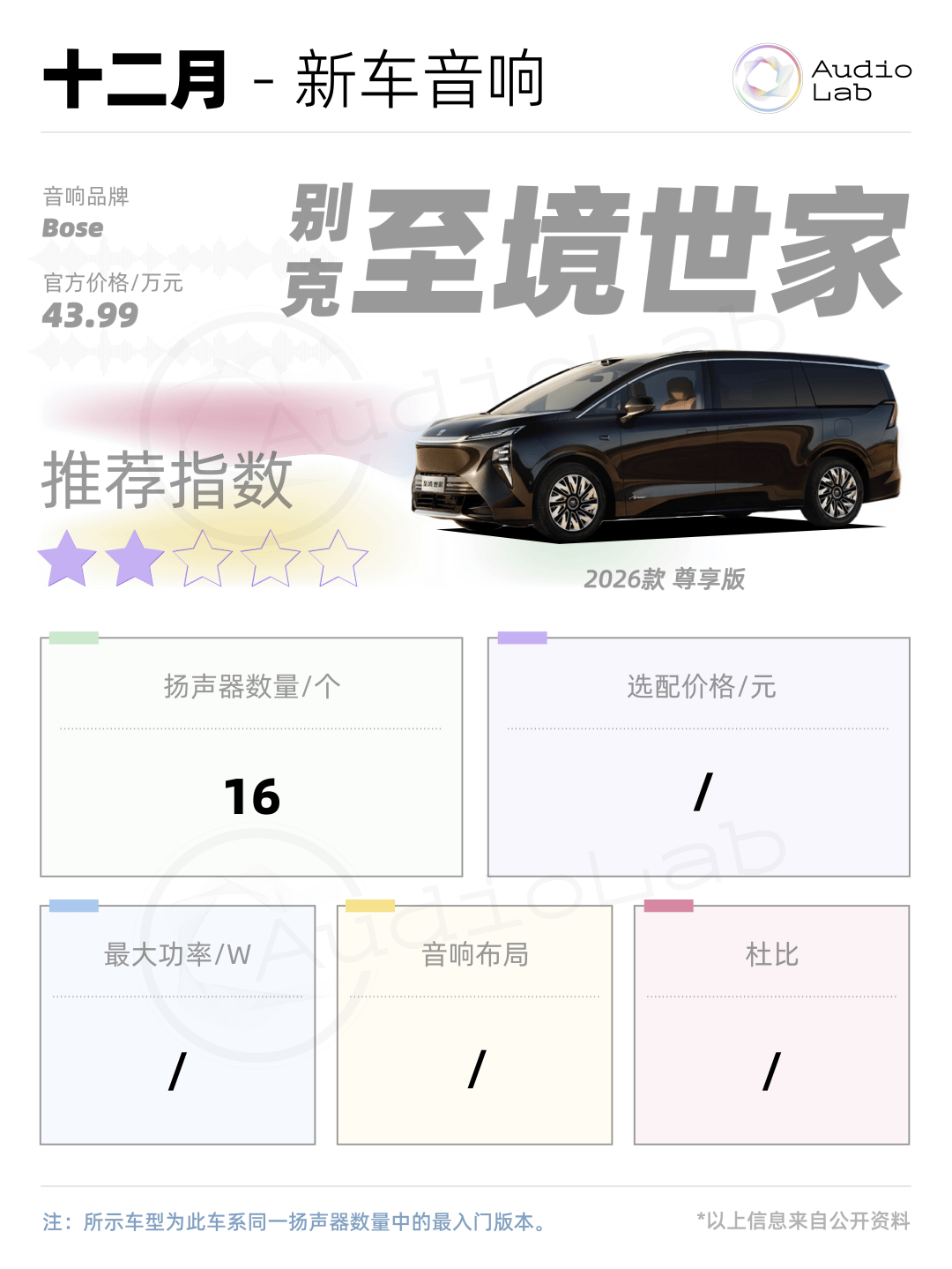 在更高端的別克至境世家上,搭載的音響品牌依然是BOSE,不過揚聲器數量上增長到了16個。