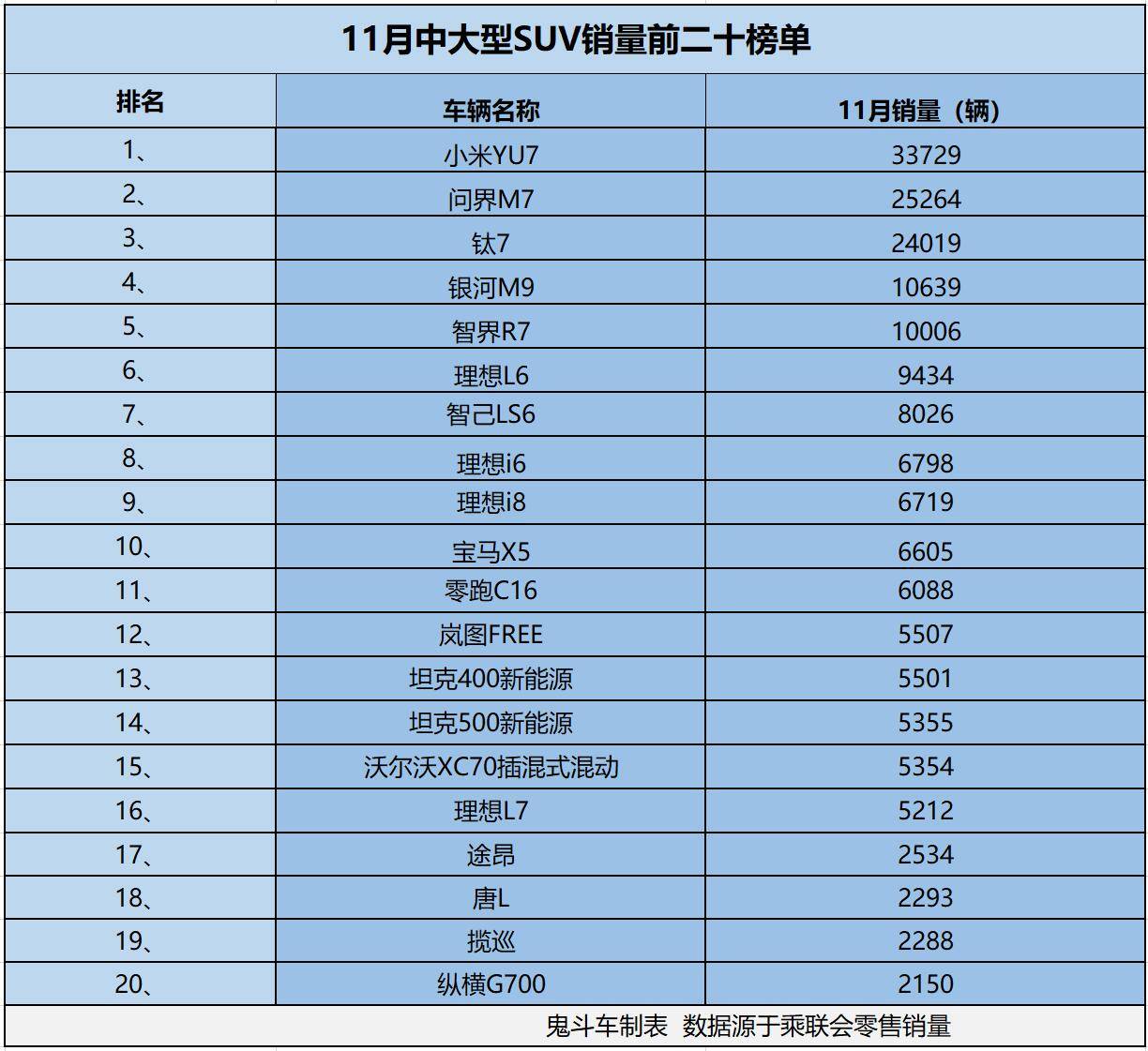 這一點,在銷量上體現得更為明顯,為了讓網友們看得更清楚,鬼哥根據乘聯會零售銷量數據整理出,11月中大型SUV銷量排名前二十榜單。榜單上,共有5款車型銷量過萬,接下來,看看榜單上具體車型的排名與銷量表現。