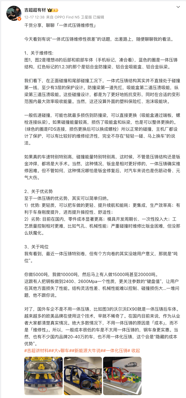 魏建軍拋出這段言論之后,網上出現了很多“稱頌之聲”,很多博主都夸贊魏建軍董事長敢說真話。但是我們看到這些言論的時候,心里還是嘀咕了一下,一體壓鑄本身不是什么炫酷的技術,前提的投入成本很大、良品率要求也很高,但是很多新的車企逐漸都在使用,我們不能完全信服,這么多的車企采用一體壓鑄,就是對用戶的使用花費不負責任。所以一定還是有深層次原因的,而很快,理想汽車材料部門負責人就出來“科普”了。