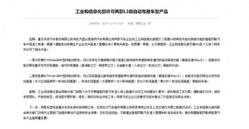 12月15日,工信部官網發布公告,長安牌SC7000AAARBEV型純電動轎車(長安深藍SL03)和極狐牌BJ7001A61NBEV型純電動轎車(北汽極狐阿爾法S6)獲得國內首批L3級有條件自動駕駛車型準入許可。這標志著國內的高等級智能駕駛從之前的“測試以及示范運營” 開始進入 “商業化應用” 的新紀元。