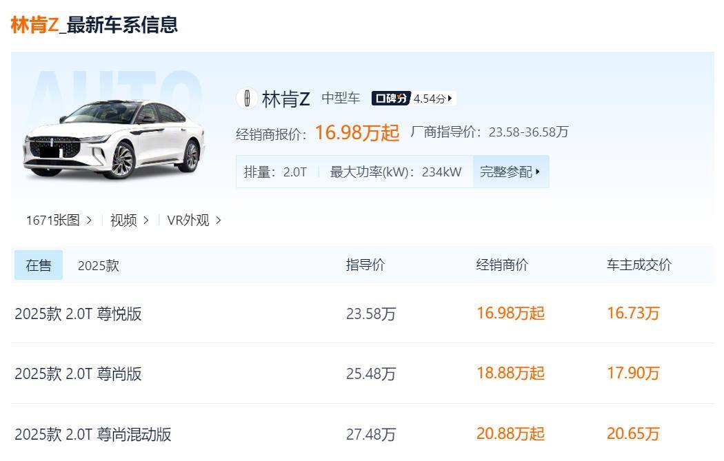 林肯Z的指導價是23.58-36.58萬,全系共有2.0T燃油和2.0T油電混動這兩種版本可選,其中主銷的是2.0T燃油版,目前共有3款車型在售,而最低配車型優惠完之后的價格則已經來到了16.98萬,堪稱最便宜的豪華中型車。