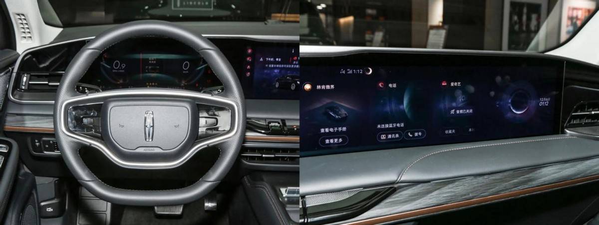 內飾配備一體式大屏,設計有點像是高級版的。中間輔以木紋裝飾進行搭配,以迎合林肯作為美式豪華的這種氣質。方向盤挺復古,預計能吸引到一部分沉穩人士的喜愛。