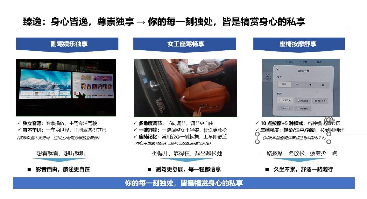在副駕的舒適性打造上,紅旗HS6 PHEV的“女王副駕”展現出了相當的誠意與巧思。它不僅支持16向多角度電動調節,為乘客提供了包括腿托、腰托在內的細致姿態調整空間;更配備了一鍵舒躺功能,可迅速將座椅調整至理想的零重力姿態,有效緩解長途乘坐的疲憊。