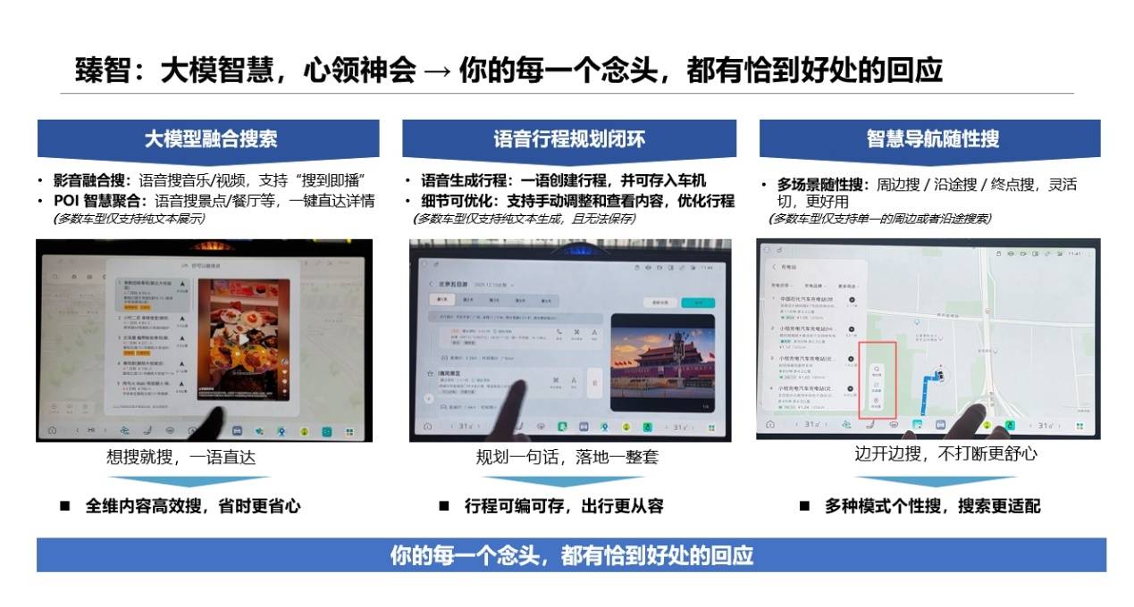 依托大模型能力,紅旗HS6 PHEV的融合搜索功能在實用性上做了不少優化。例如,語音搜索音樂或視頻時,系統可自動跳轉至相應應用并直接播放;查找景點、餐廳等POI信息時,也能一鍵聚合視頻介紹與導航選項,實現從“搜索”到“操作”的連貫體驗。這背后的邏輯并不復雜,卻貼近真實用車場景——將多個步驟簡化為一句指令,減少操作分心,讓搜索真正服務于高效出行。