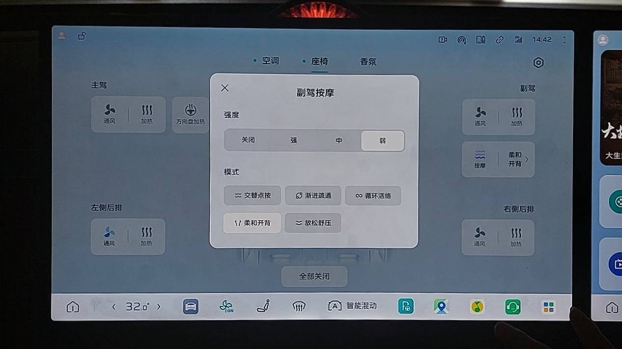 在座椅舒適性配置上,紅旗HS6 PHEV的座椅按摩系統提供了頗為細致的體驗。其采用10點式氣動按摩機構,支持交替點按、漸進疏通等5種專業按摩模式,并可進行輕柔、適中、強勁三檔強度調節,允許乘客根據自身疲勞狀況精準選擇。對比市面上常見的8點按摩配置,更多的點位意味著對肩背、腰部等關鍵肌群能有更貼合、更到位的舒緩覆蓋。