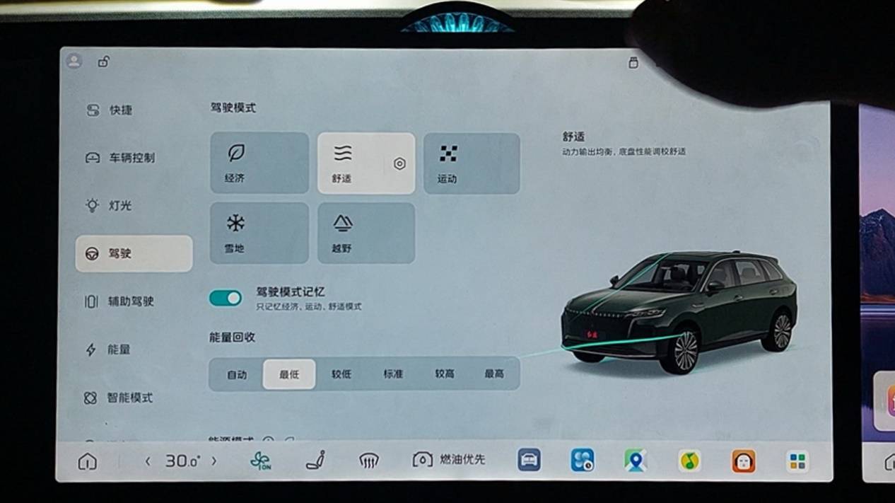 紅旗HS6 PHEV在駕駛模式與能量管理上提供了頗為周全的搭配。車輛提供包括經濟、舒適、運動在內的3種常規模式,以及針對特殊路況的越野與雪地模式,共5類駕駛選擇。同時,其插混系統支持智能混動、純電優先、燃油優先及增程模式共4種能量策略,用戶可根據路況、電量與駕駛意圖自由組合。