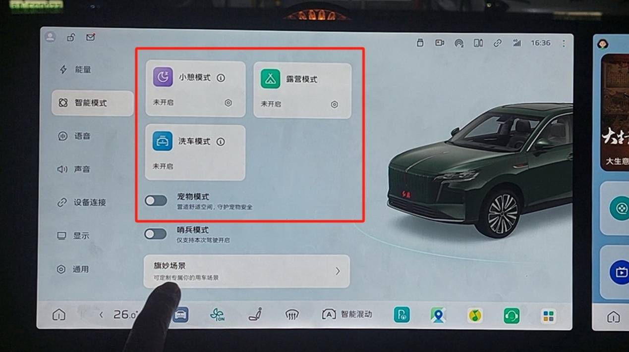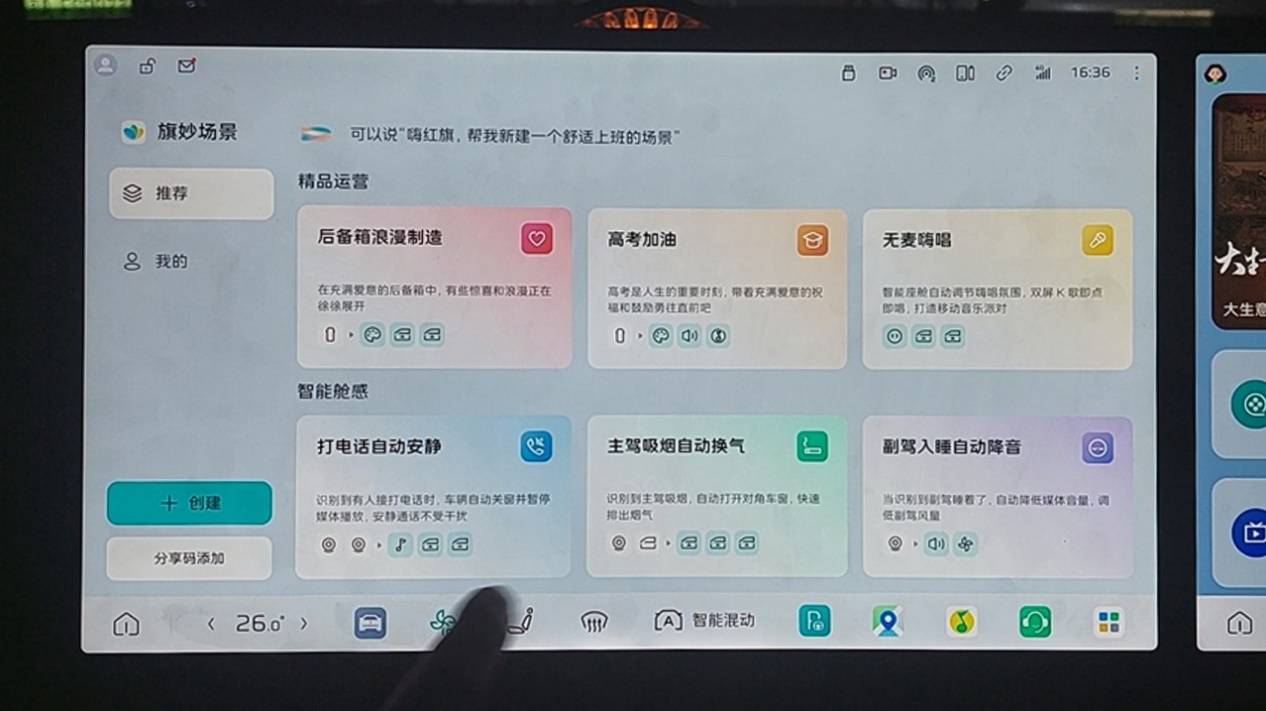 紅旗HS6 PHEV 的擁有多種場景模式,通過預設場景模板,提供小憩、露營、寵物、洗車等一鍵場景切換,簡化設置過程。例如在小憩模式下,座椅自動調整到舒適姿態,并且把空調調至舒適溫度,配合白噪音,可以在工作日的午間輕松休息。除固定的場景模式外,配合多屏聯動,還可以協同實現觀影、游戲或K歌的環繞式體驗,增強氛圍的投入感。