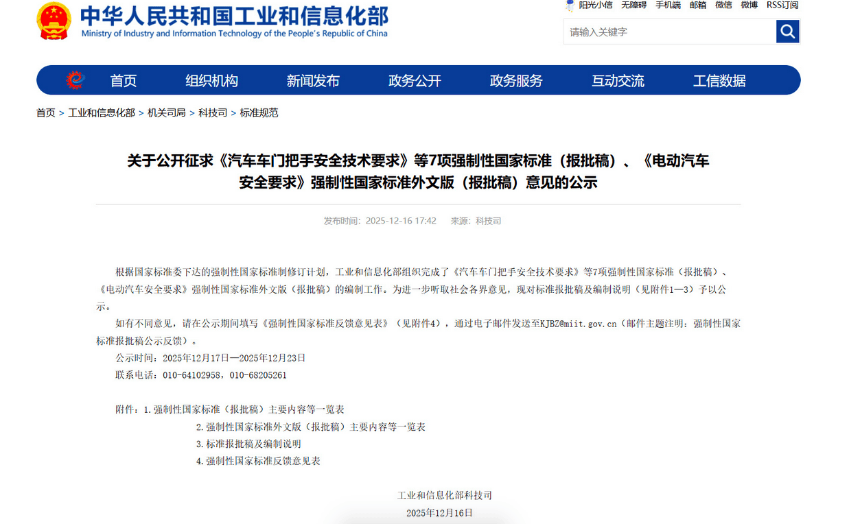 面對越來越多的安全質(zhì)疑,中國監(jiān)管部門率先出手。今年12月,工業(yè)和信息化部完成了《汽車車門把手安全技術(shù)要求》強(qiáng)制性國家標(biāo)準(zhǔn)的編制工作,明確禁止全隱藏式門把手設(shè)計。