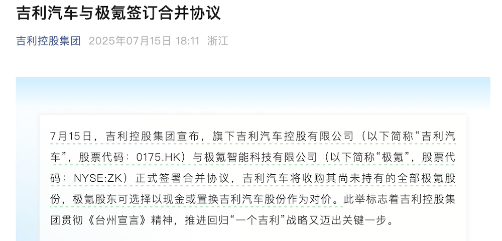 5月7日,吉利汽車宣布,公司向極氪汽車提交非約束性報價函,建議私有化極氪汽車。到了今年7月,吉利汽車與極氪正式簽署合并協議。