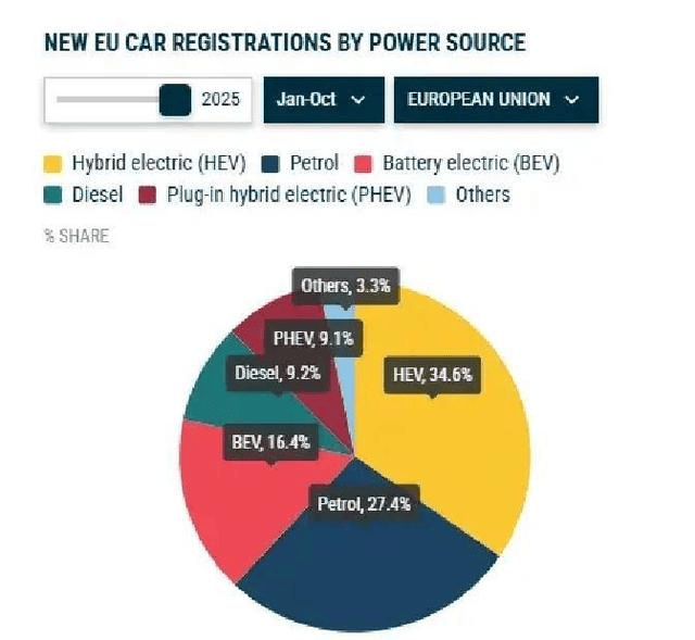 2025年1月-10月,歐洲純電動(dòng)車銷量占比僅為16.4%。