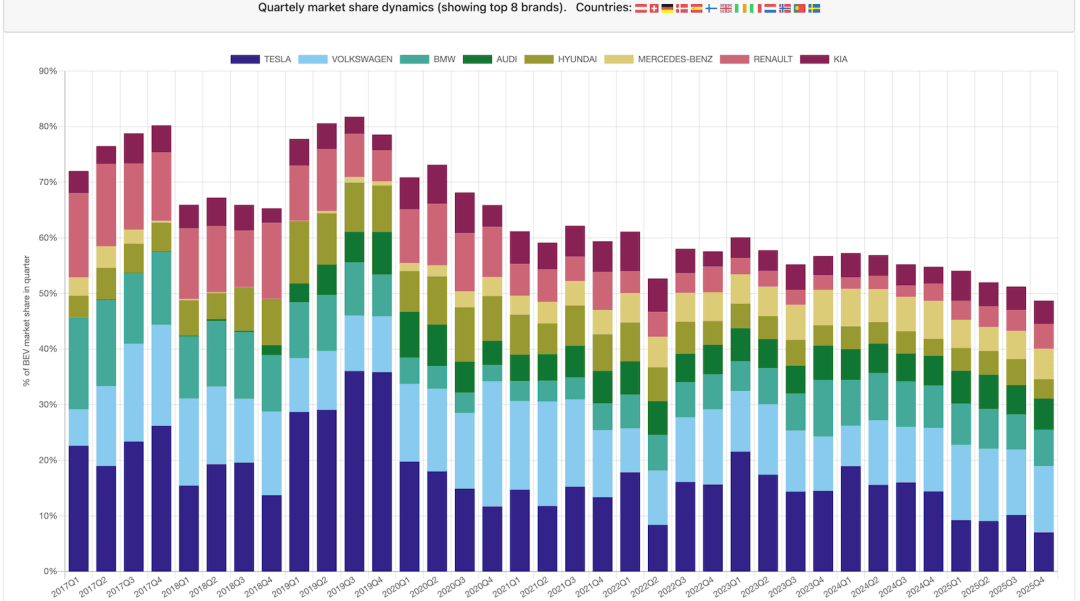 這并非個(gè)例,過去8年,特斯拉在歐洲的份額也呈下降趨勢(shì)。將2017年第三季度與2025年第三季度相比,市場(chǎng)占比從23.4%降至10.2%。