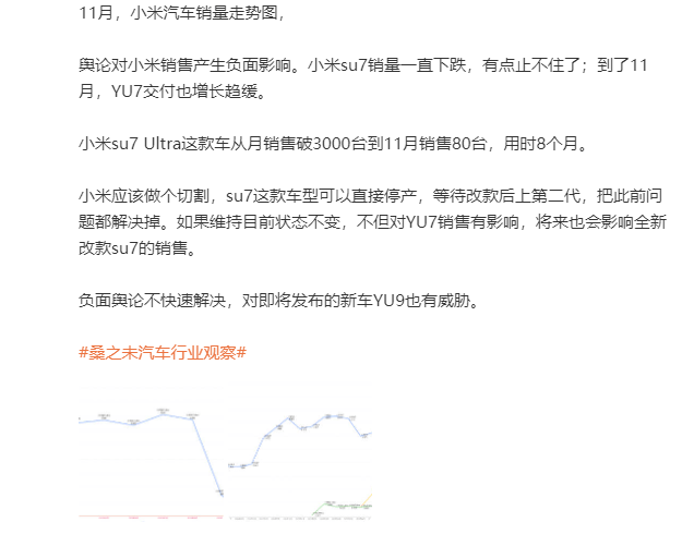 近日,有媒體爆出,小米汽車的旗艦車型——小米SU7 Ultra,11月只售出80輛,這一數字甚至不及今年3月其巔峰時期的零頭。