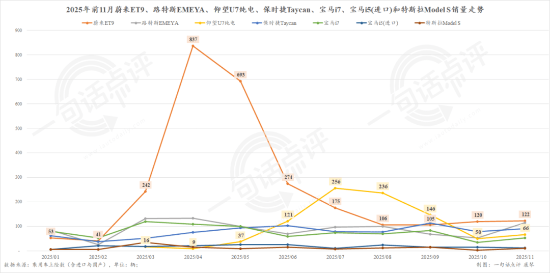 為此,挑選了蔚來ET9、路特斯EMEYA、仰望U7純電版、保時捷Taycan、寶馬i5(進口)、寶馬i7和特斯拉Model S這7款車型為研究對象,它們都是起售價50萬元以上的純電轎車,而且銷量相對靠前,通過對今年內它們的銷量分析來了解該細分領域的整體情況和變化。