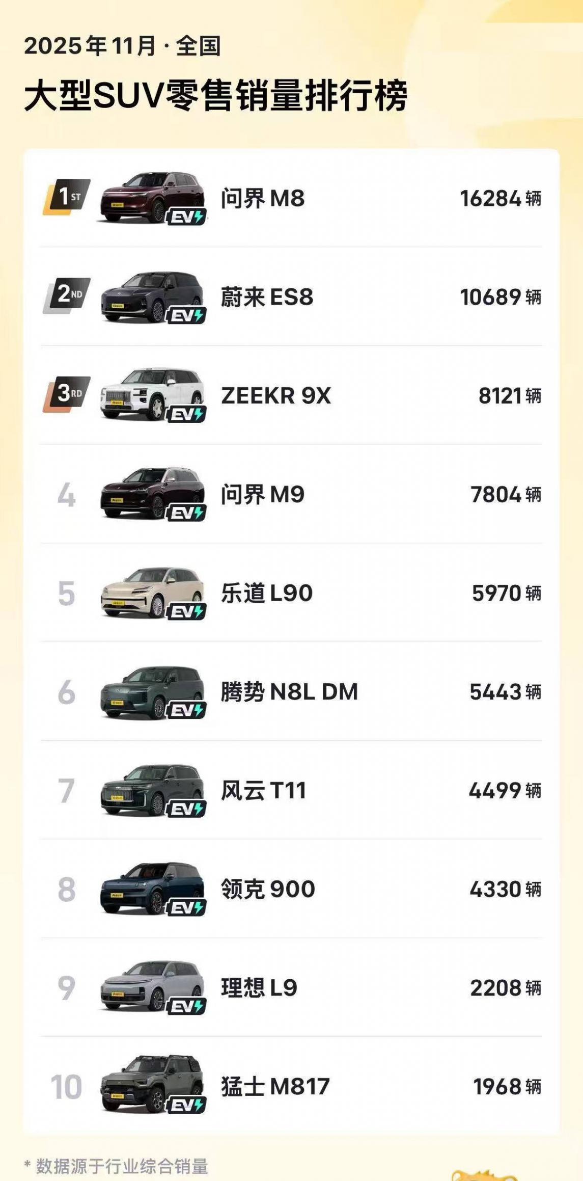目前,這個市場的競爭核心維度已發(fā)生根本性遷移。從11月銷量榜單來看,問界M8、蔚來ES8、極氪9X等位列前茅的車型,均價都在40萬元以上。這標(biāo)志著它們已成功突破價格天花板,徹底激活了高端新能源大三排SUV細(xì)分市場。