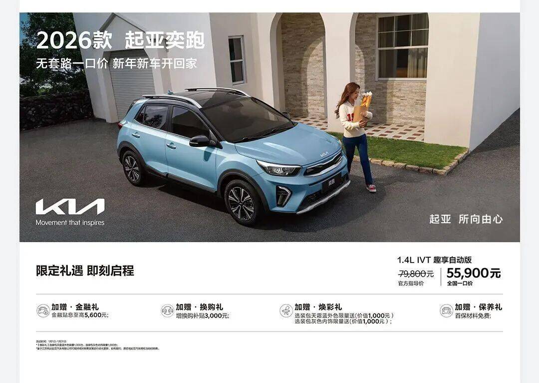 起亞奕跑是起亞旗下小型SUV,由起亞Stonic國產(chǎn)而來,于2017年發(fā)布,2018年由東風(fēng)悅達起亞國產(chǎn)并命名為“奕跑”,同年8月22日正式上市,售價區(qū)間為6.98-7.98萬元。2020年10月,中期改款起亞奕跑上市,售價不變,但部分車型配置有所取消。2025年11月1日,2026款奕跑上市,共推出兩款車型,指導(dǎo)價分別為7.98萬元和8.38萬元,其中1.4L IVT天窗款雙11增換購補貼價為6.48萬元。動力方面,新車依舊搭載1.4L自然吸氣四缸發(fā)動機,最大功率100馬力,最大扭矩132.4牛·米,匹配6速手動變速箱以及CVT無級變速箱。