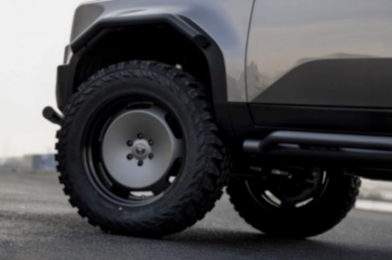 最引人注目的當屬那大尺寸輪轂,搭配之后整車酷似一臺1:1還原的玩具越野車。新車裝配了一套22英寸的Kuhl Verz DR03內凹式合金輪轂,并匹配了胎紋粗獷的37英寸橫濱Geolandar M/T G003泥地輪胎。