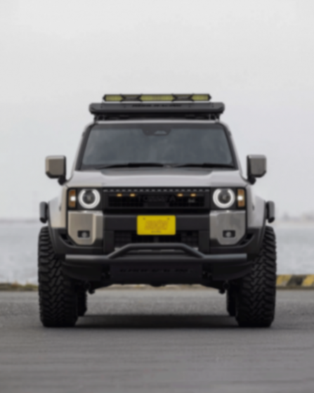 整車車身部件全面升級為鋼制套件,加裝了前后保險杠護杠、側踏板,以及直徑達70毫米的粗壯管狀輪眉。車輛頂部加裝了品牌定制底盤護板,既能保護車身底部,又能搭配全尺寸車頂行李架,架起一盞40英寸IPF LED長條射燈;車尾還配備了車頂擾流板延伸件和尾門專屬擾流翼。