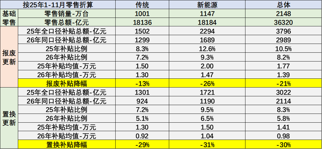 總體看,26年報廢更新車型的補貼均值較25年降21%,26年置換更新車型的補貼均值較25年降30%。