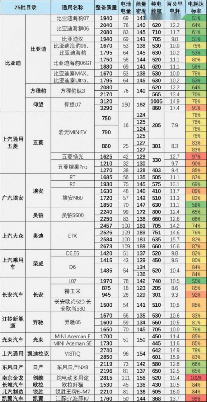 2025年末公布的第25批新能源汽車免征車輛購置稅目錄中,純電動乘用車產品表現(xiàn)亮眼,核心體現(xiàn)在電耗控制能力的大幅提升,充分彰顯行業(yè)技術升級成效。其中,比亞迪、廣汽埃安、長安汽車等企業(yè)的新款純電動車型,電耗較行業(yè)標準值低40%,處于行業(yè)領先水平。