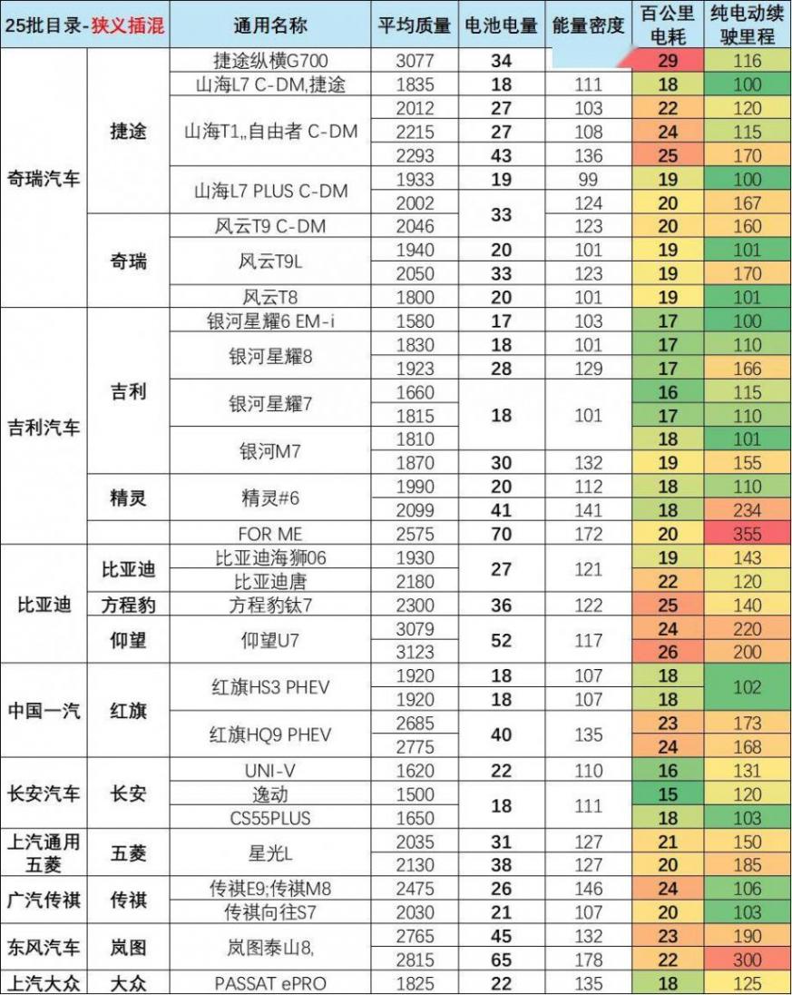 狹義插混乘用車在第25批目錄中呈現(xiàn)“量質齊升”態(tài)勢:一方面產品矩陣持續(xù)豐富,覆蓋不同細分市場需求;另一方面核心技術不斷突破,電耗控制能力顯著提升,油電平衡性能優(yōu)化,為2026年新能源乘用車市場的穩(wěn)步增長奠定堅實基礎。