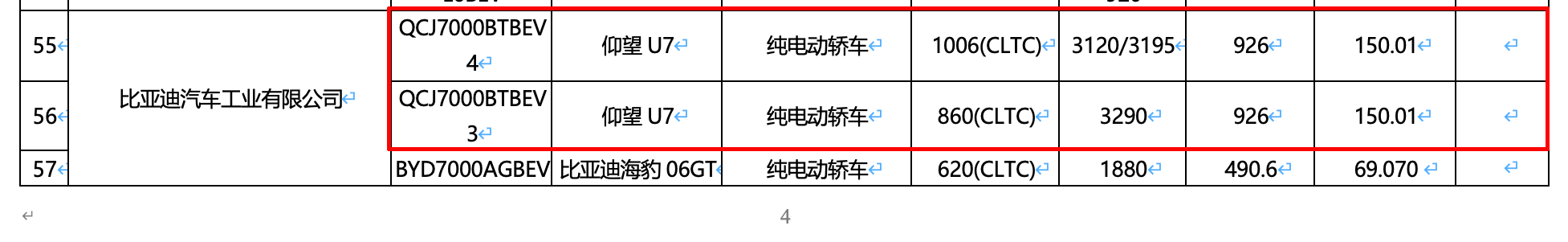 其中仰望U7申報了兩款搭載150.1度超大電池的車型,CLTC純電續(xù)航里程分別為1006公里和860公里,同樣的電池,純電續(xù)航里程差了146公里,我們猜測這可能是這款車比亞迪旗下的旗艦轎車產(chǎn)品會通過電機數(shù)量來進(jìn)行價格區(qū)分,而電池數(shù)量則直接影響到了續(xù)航的實現(xiàn)。不過1006公里的CLTC純電續(xù)航里程,看上去就非常震撼,當(dāng)然150度的大電池,可能也會讓車輛自重大增,不過仰望U7有電動懸掛,增加的這點重量都不是事兒。