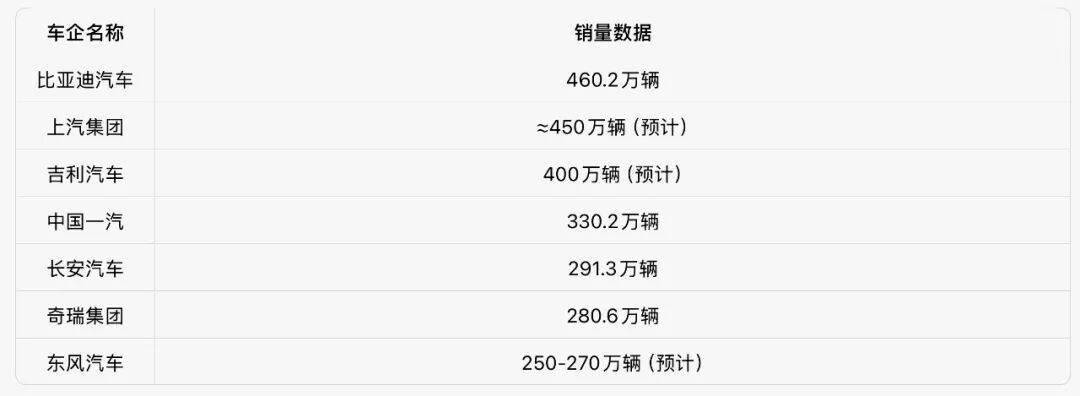 根據各汽車廠家公布的數據和預測(含出口、合資企業及海外控股企業),2025年國內汽車企業集團中,比亞迪以460萬輛銷量名列前茅;上汽集團以450萬輛(預計)緊隨其后;吉利控股集團以400萬輛(預計)名列第三;一汽集團以330萬輛名列第四;長安汽車以291.3萬輛名列第五;奇瑞集團以280.6萬輛名列第六。東風汽車以250萬輛(預計)名列第七。