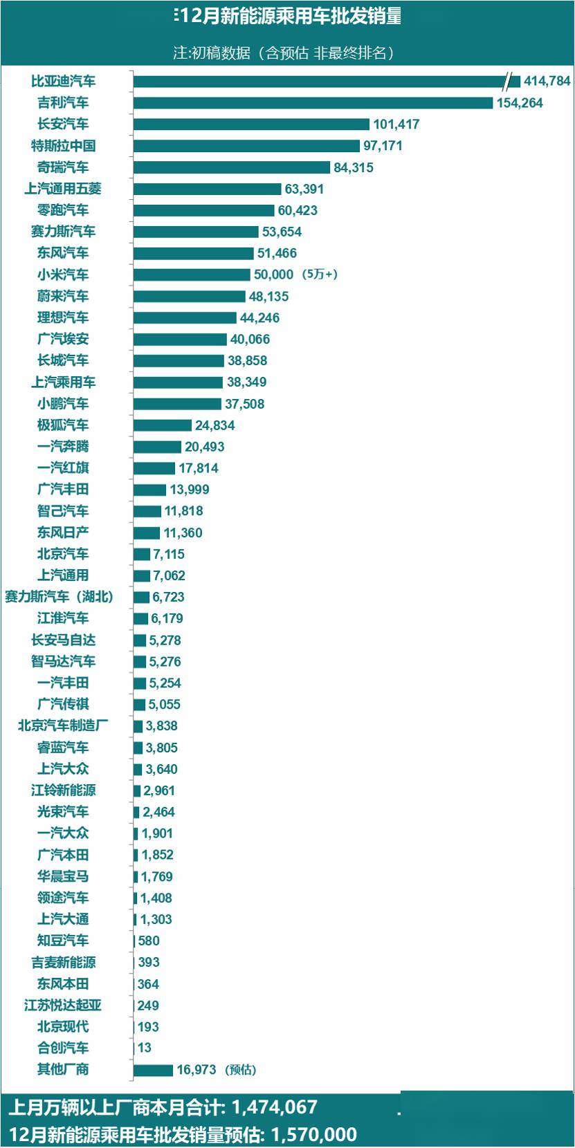 根據乘聯分會最新數據,全國乘用車市場2025年11月,新能源銷量萬輛以上廠上的批發銷量,占總體新能源乘用車當月銷量的94%。根據1月初步匯總數據,這些11月新能源銷量萬輛以上廠商企業的12月銷量為147萬輛。目前絕大部分廠商銷量基本都已經鎖定,因此按照上月結構占比結合本月數據,測算12月的全國新能源乘用車批發銷量為157萬輛。