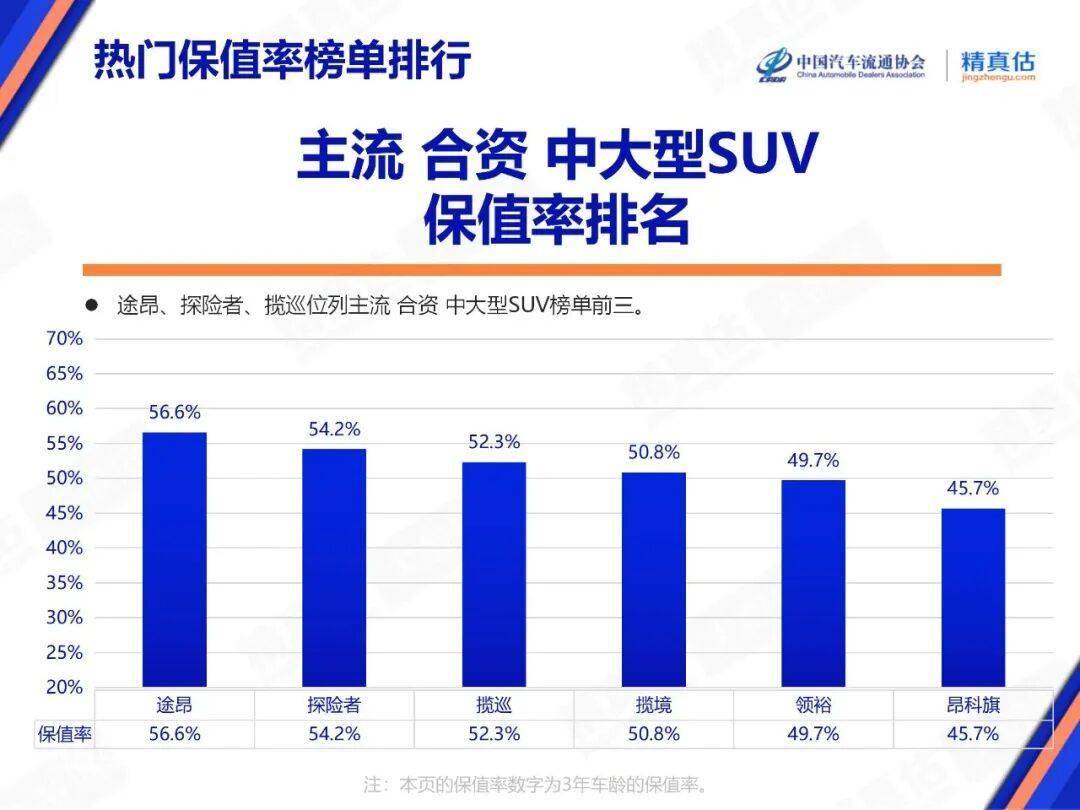 在主流合資中大型SUV市場,上汽大眾的途昂憑借大空間、高配置精準滿足了用戶對寬敞乘坐與裝載能力的剛需,并依靠大眾品牌的品質信任和龐大的用戶基礎,確保了車型的認知度和流通性,保值率排名第一;探險者、攬巡分列保值率第二、第三名。