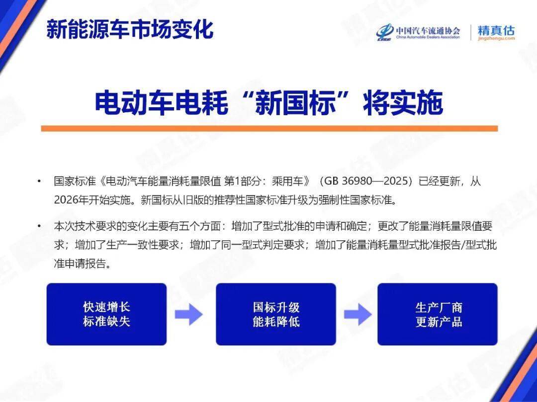 本次新國標最引人注目的技術指標是電動車的能耗水平:電耗與車型質量(重量)直接掛鉤。以2噸重的車型為例,百公里電耗不應超過15.1度電。與舊標準相比,在電池容量不變的情況下,續航里程將提高約7%,這促使生產廠商做出技術升級。二手車方面,盡管新規并不限制二手車的流通,但新車的升級將會影響消費者的購車決策。能耗和續航也是用戶體驗方面比較重要的指標。