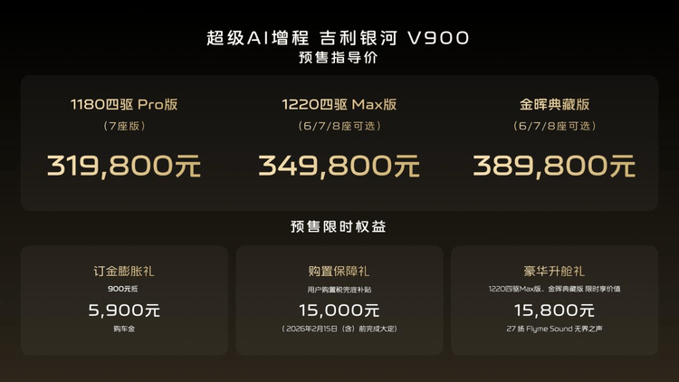 此次預售的三款車型配置梯度清晰,1180 四驅 Pro 版(7 座版)定價 31.98 萬元,1220 四驅 Max 版(6/7/8 座可選)售價 34.98 萬元,金暉典藏版(6/7/8 座可選)為頂配版本,價格 38.98 萬元。