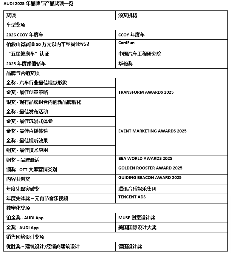 同時,銷售與服務網絡將持續擴容,為用戶提供專屬豪華體驗。宋斐明表示,品牌將深化本土承諾,攜手合作伙伴帶來更多融合奧迪精工與中國數字活力的產品,共塑豪華電動出行未來。 此外,2025年AUDI品牌還斬獲多項重磅榮譽,涵蓋車型、品牌營銷、數字化、銷售網絡設計等多個領域,彰顯全方位實力。
