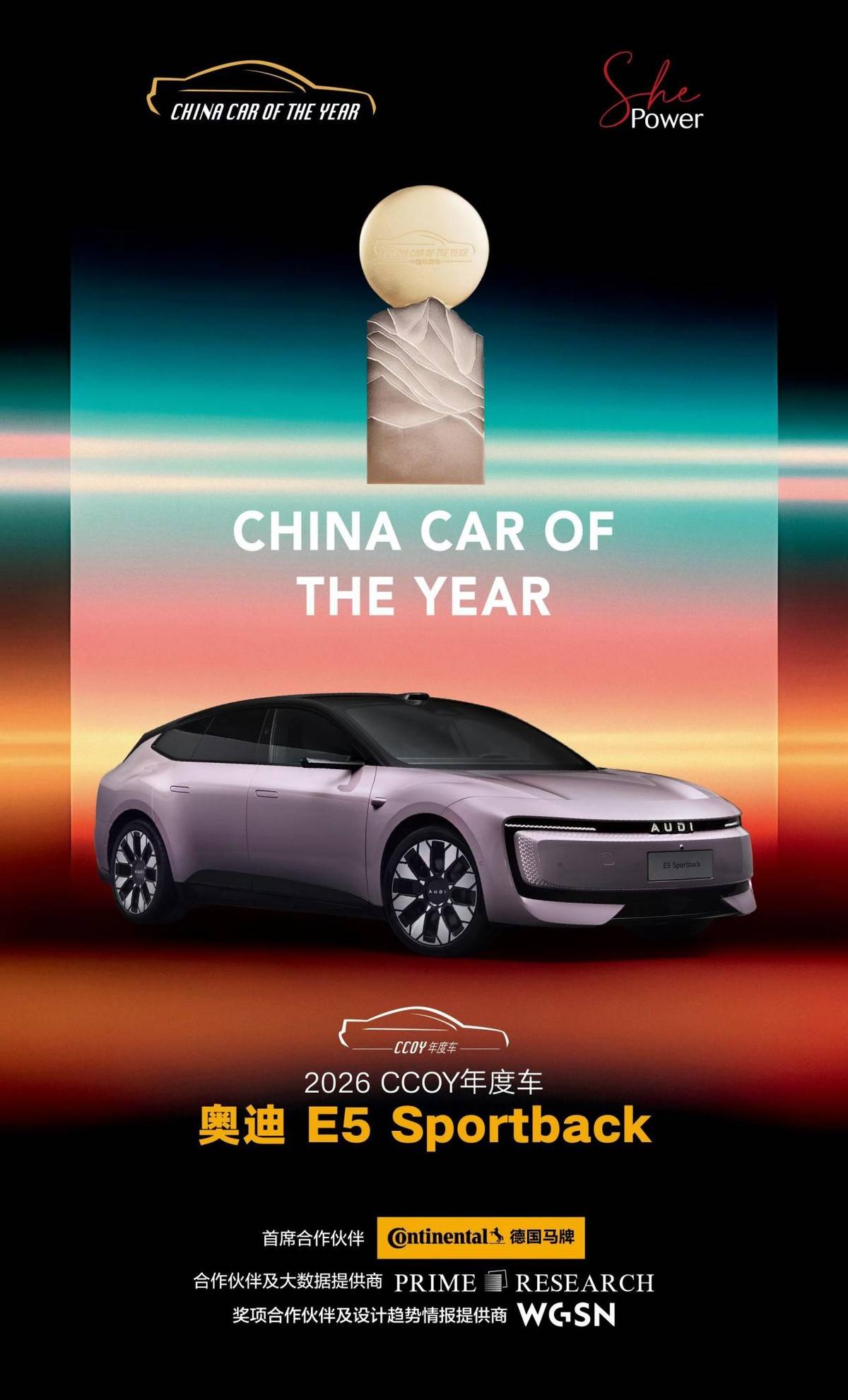 2026年1月8日,奧迪E5 Sportback在行業媒體專家評審團的評選中脫穎而出,斬獲“2026 CCOY年度車”大獎,創下該獎項歷史紀錄——成為全新品牌首款車型發布首年即獲此殊榮的車型,印證了AUDI品牌元年的成功,贏得市場與行業雙重認可。