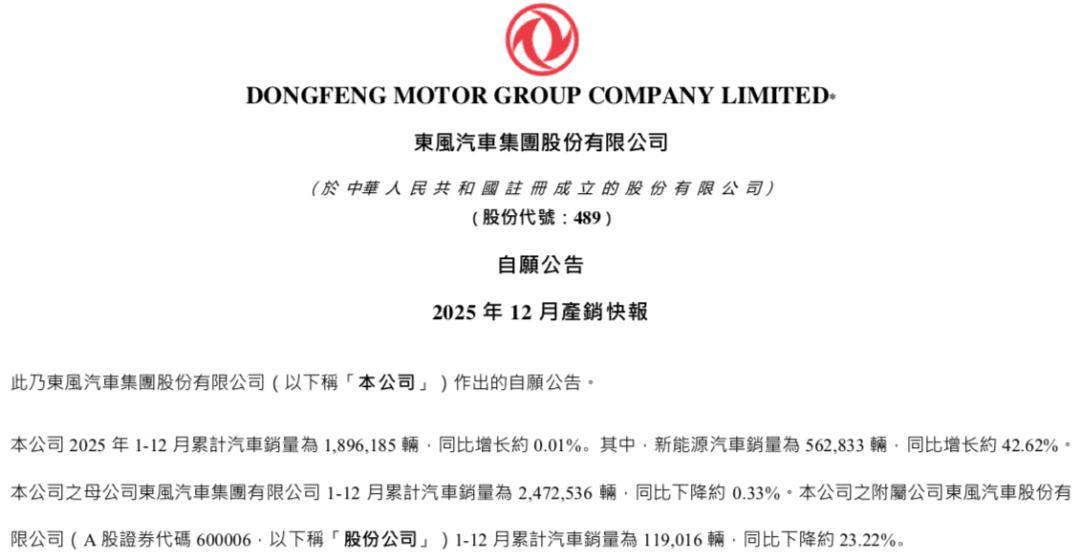 1月12日,東風汽車集團股份有限公司(下稱“東風汽車集團”)發布2025年12月以及2025年全年銷量數據。數據顯示,2025年12月東風汽車集團銷量為19.92萬輛,同比增長3.12%。其中,新能源汽車銷量為7.36萬輛,同比增長71.11%。截至12月底,2025年全年,東風汽車集團累計銷量為189.62萬輛,同比增長0.01%。其中,新能源汽車累計銷量為56.28萬輛,同比增長42.62%。