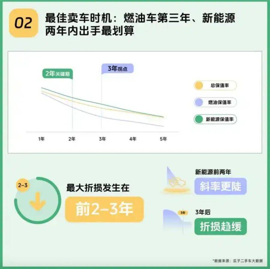 據瓜子平臺數據測算,燃油車第一年綜合保值率約為66%,折損最為明顯。第三年時整體價格折損接近一半,但在三年之后,折損曲線明顯放緩,價格趨于穩定。這說明燃油車主,在3年內把車賣掉,能更好的鎖定車輛的剩余價值。