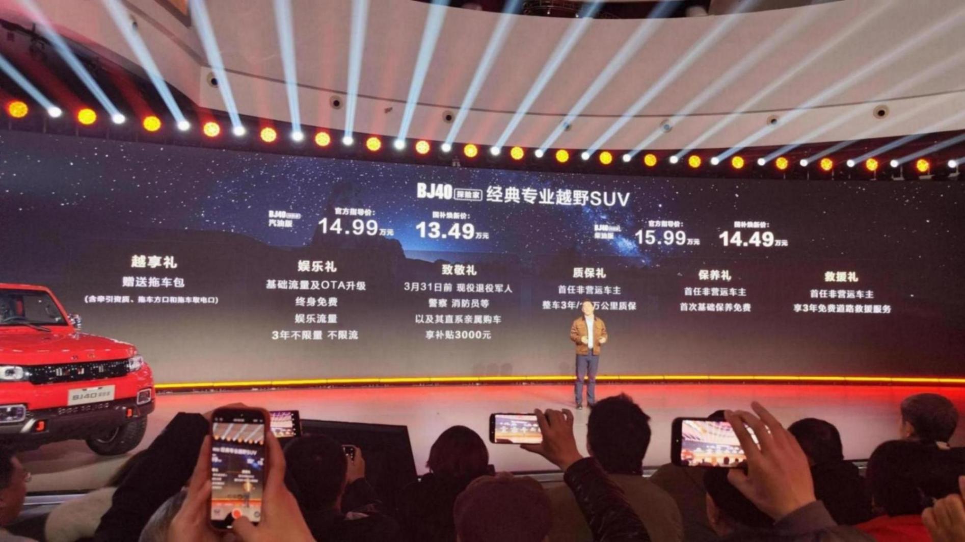 1月15日,“經典之上,再造經典”BJ40探險家上市發布會在北京汽車博物館舉行。會上,BJ40探險家正式上市。新車共推出2個版本,官方指導價14.99-15.99萬元,國補煥新價13.49-14.49萬元。同時可享受價值1.2萬元的尊享禮遇。作為北京越野BJ40系列的新增版本,該車在傳承家族硬派基因的基礎上,針對內飾科技感與實用配置進行升級優化。