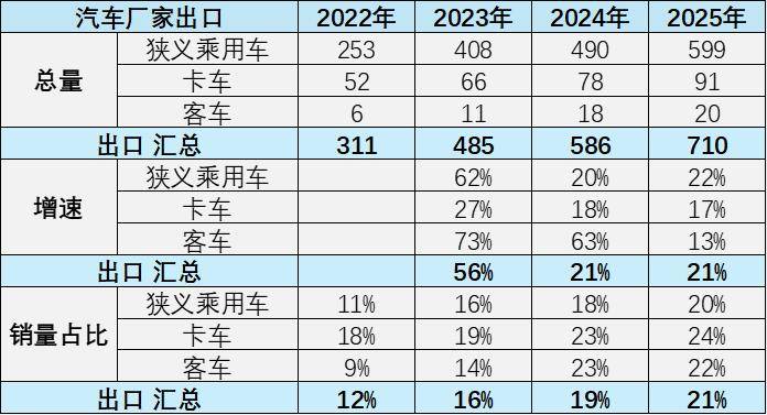 2025年我國汽車出口呈現“量價齊升、結構優化”的核心特征。全年汽車廠家國產車出口總量達710萬輛,同比增長21%,較2024年增速持平,繼續保持全球汽車出口第一大國地位,反映出我國出口汽車的產品附加值顯著提升。