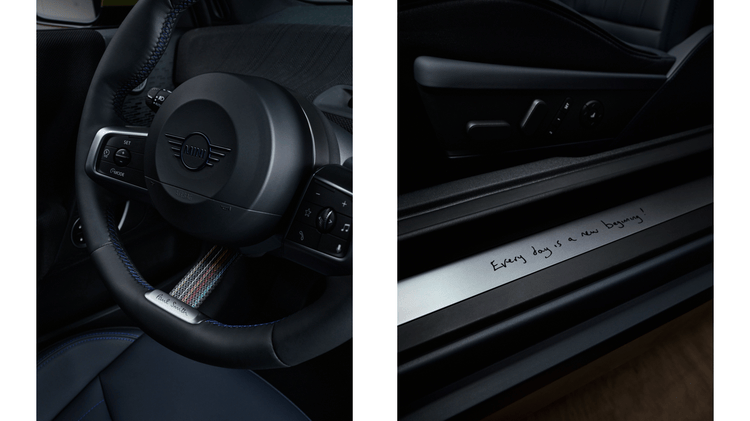 Paul Smith的標志性彩色條紋元素,在車上以克制而精巧的方式呈現:駕駛員側車頂彩色亮眼條紋、方向盤10色編織帶、儀表臺立體暗紋織物……這些細節如同隱藏的彩蛋,在方寸之間展現設計功力與美學態度。解鎖時地面投射手寫體“Hello”,腳墊暗藏手繪幸運兔,迎賓踏板刻“Every day is a new beginning”,所有簽名、手寫體元素均為原廠獨立編號零件。為了保留這份手寫的溫度與獨特性,MINI工程師甚至為此開發了專屬零部件,并承諾即使未來車型停產,相關零部件也將持續供應至少12年。