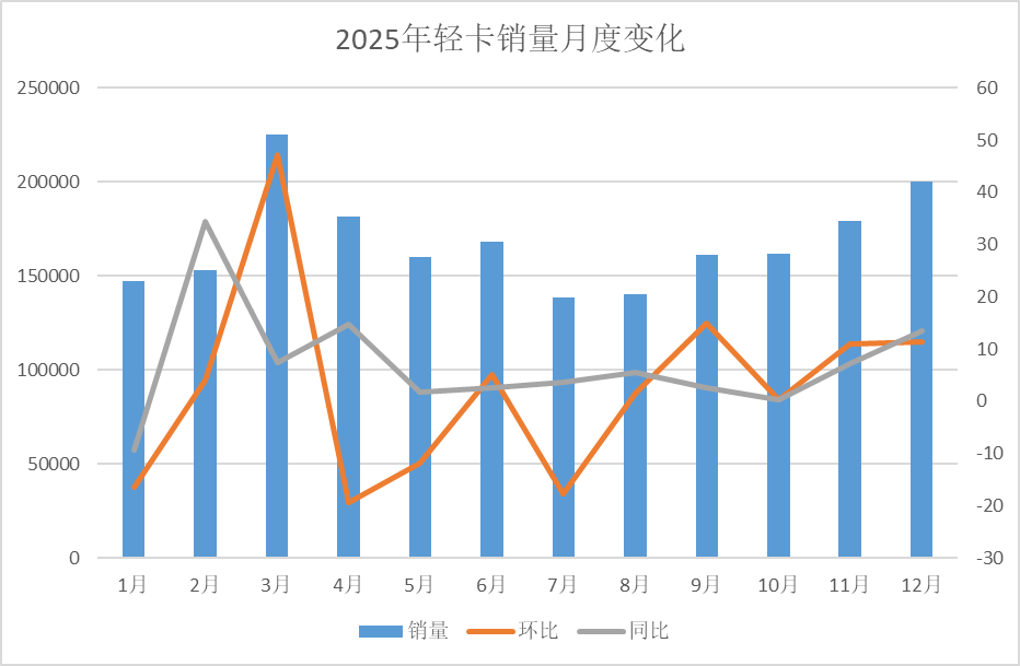 2025年,輕卡累計銷量202.36萬輛,同比增長6.52%,成功突破200萬輛,實現(xiàn)豐收年。