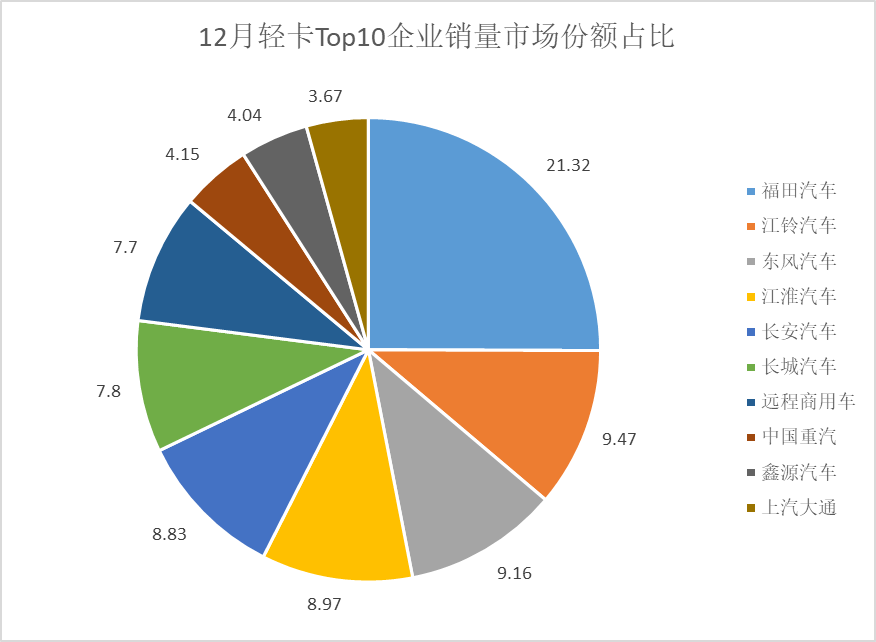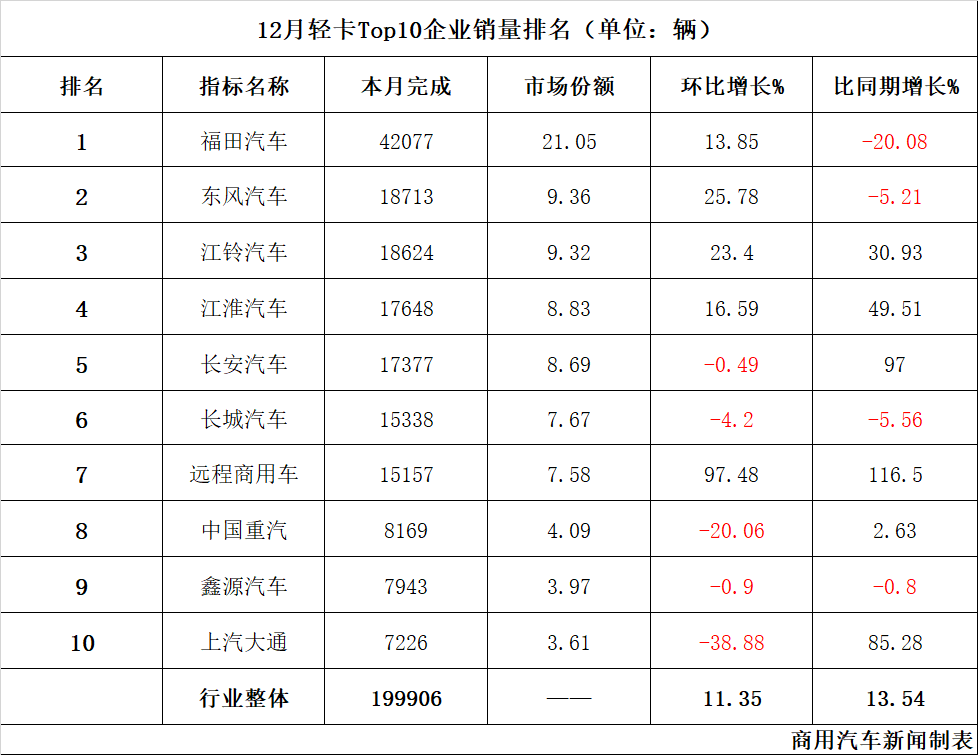 聚焦12月單月銷量,福田汽車以42077輛的成績穩(wěn)居榜首,銷量大于第2和第3名之和,地位穩(wěn)固。另外,實現(xiàn)1.5萬輛以上銷量的分別為東風(fēng)汽車、江鈴汽車、江淮汽車、長安汽車、長城汽車和遠(yuǎn)程商用車。