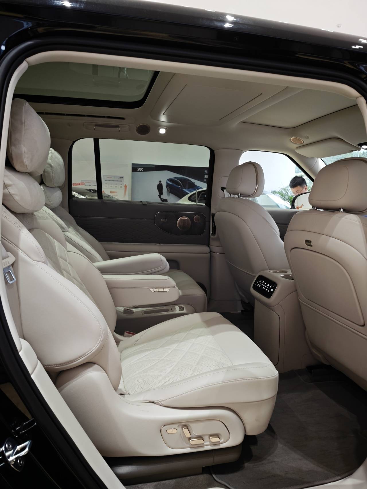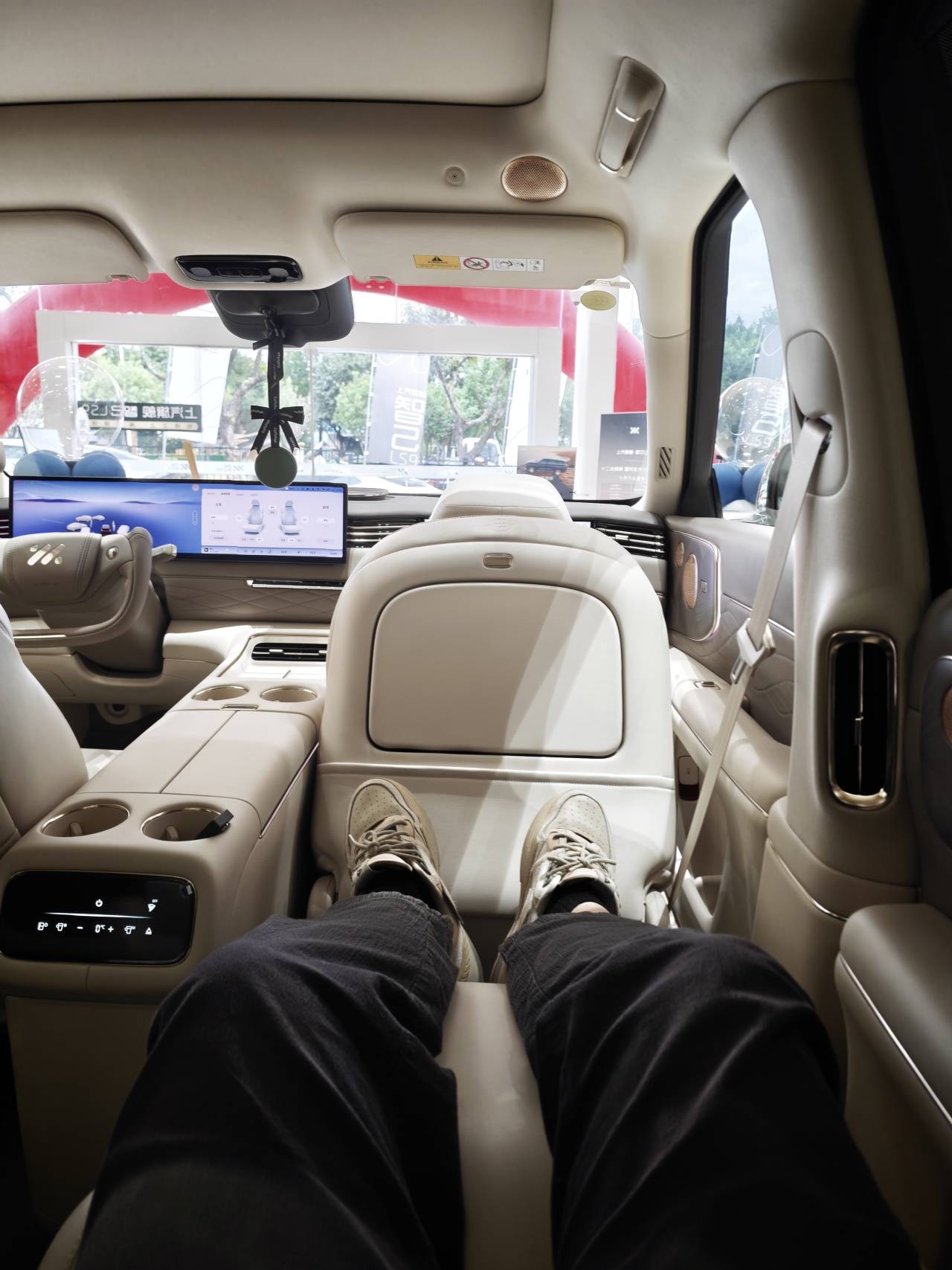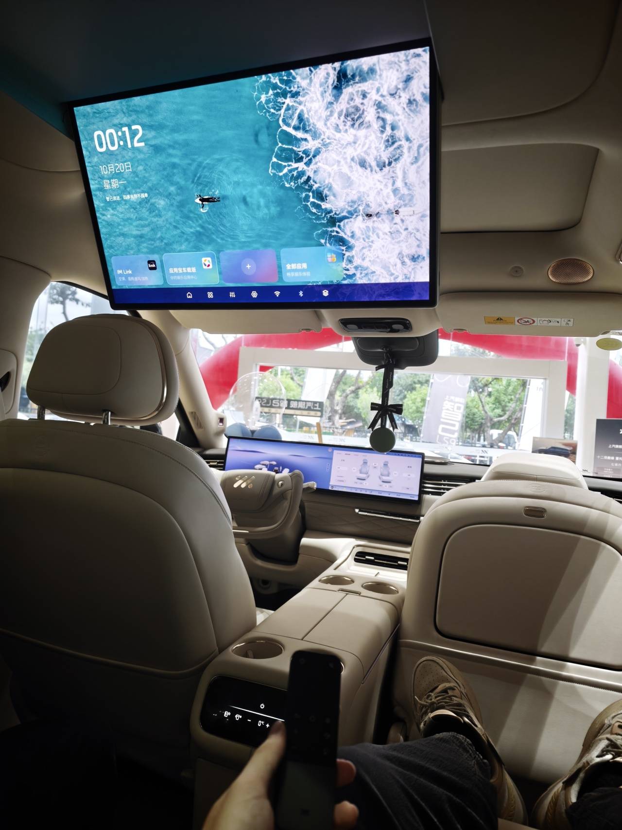 特別是在右后座上打開零重力座椅和座椅按摩,有那么一瞬間我仿佛穿越到了公司休息區的按摩椅上。不過也因此,主駕座椅就沒有腰托了,實在沒地兒放了。同時,座椅方面有一點比較影響內飾的高級感——二排內側扶手的質感有點松垮,這也是此類扶手的通病了。
