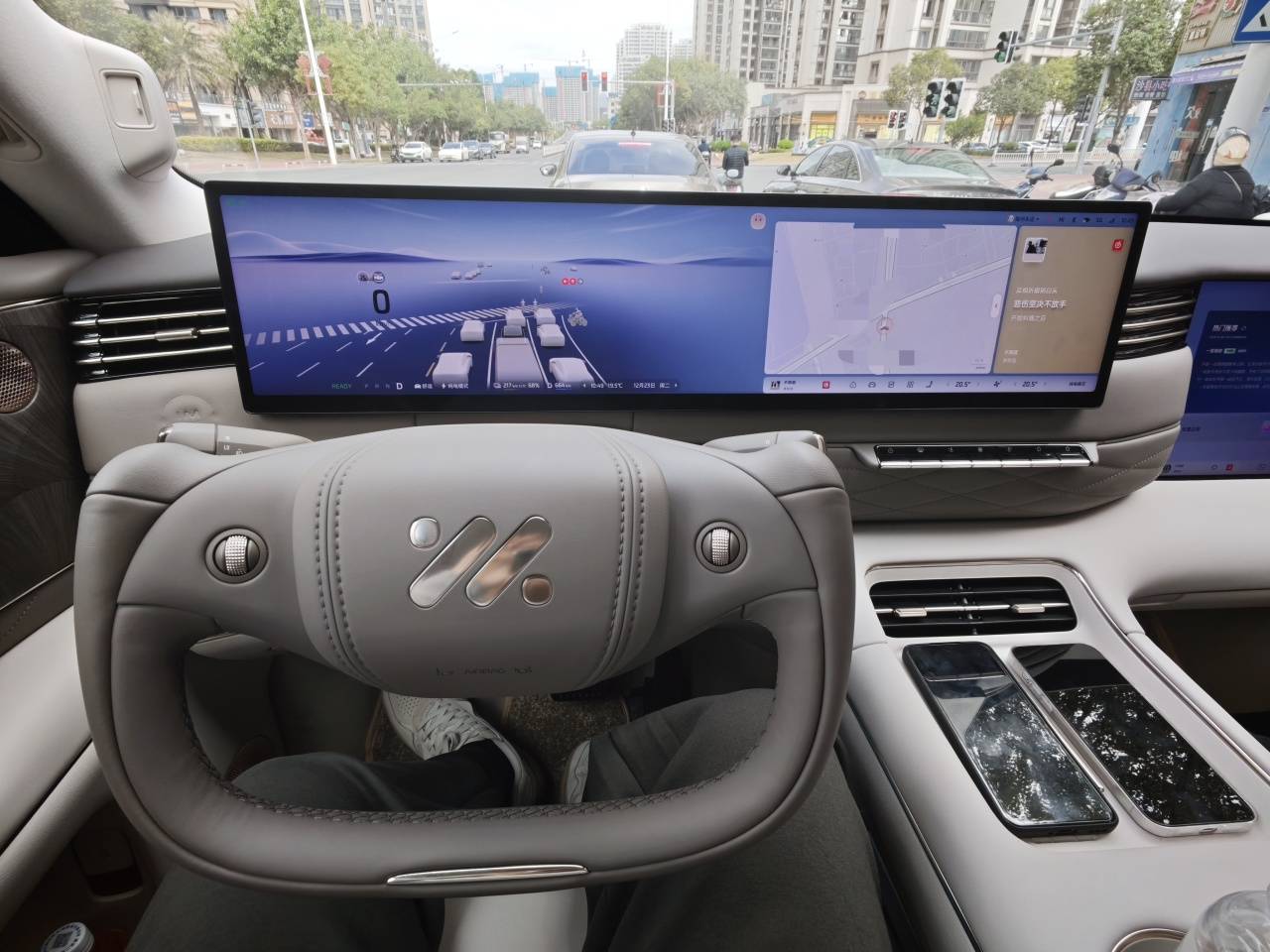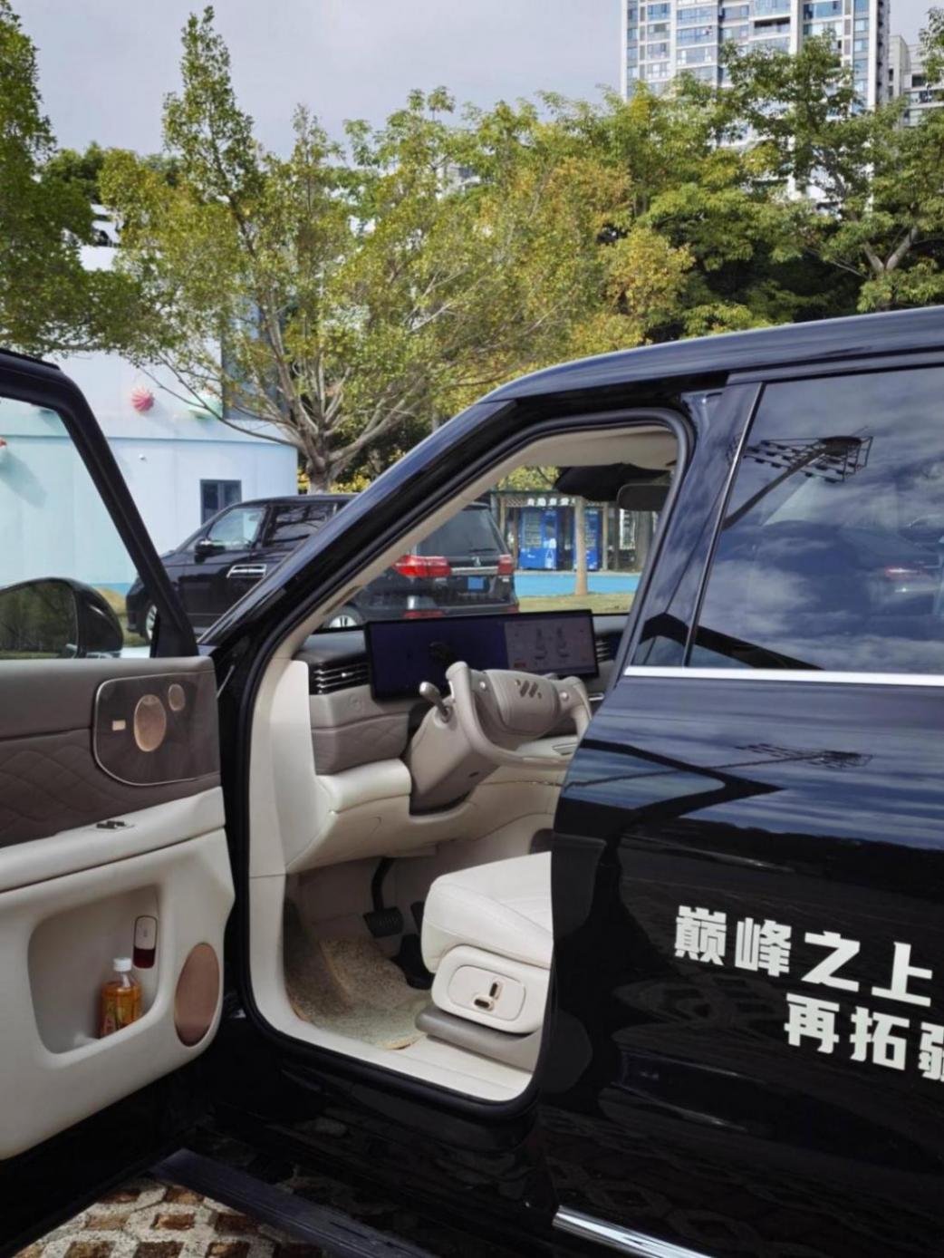打開車門,在之前LS6的預防針之下,這內飾設計我已經比較習慣了。不過這個半幅方向盤依然讓我很難評——不只因為我是一個堅定的圓形方向盤支持者,更是因為半輻方向盤讓我在停車場里挪車時直接掏空了兩把,給我嚇出一身冷汗。還好,智己也給用戶提供了一個造型很規整大氣的全幅方向盤可選。