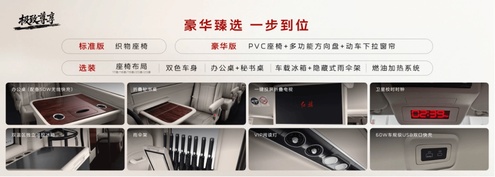 此外,營運(yùn)專屬一鍵投屏折疊電視、60W車規(guī)級USB雙口快充、衛(wèi)星信號毫秒級自動校時時鐘等配置,充分滿足娛樂與辦公需求。針對不同出行場景,紅旗金葵花國悅營運(yùn)版還提供了豐富的個性化選裝,提供包括集成50W無線快充的辦公桌、車載冰箱、雨傘架等豐富原廠選裝配置。