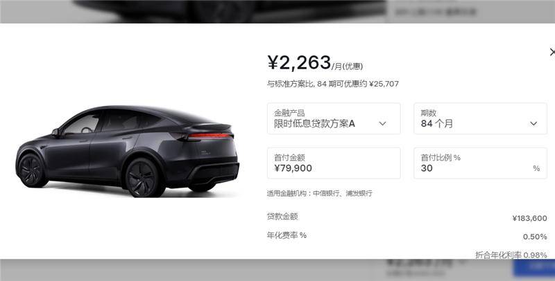 7年低息和3年/5年免息的潮流,都是特斯拉掀起的。今年年初,特斯拉新推出的7年超低息,相比常規的金融方案,可以為消費者節省大概2萬甚至更多的利息,以指導價26.35萬元的Model Y為例,首付7.99萬元,分期84個月,月供2263元,七年總利息不到6500元,折算下來年化費率約0.5%,這是相當低的,的確稱得上是超低息。