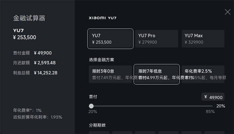 隨后也推出了7年低息方案,似乎是瞄準了特斯拉,針鋒相對。以指導價25.35萬元的YU7為例,首付4.99萬元,分期84個月,月供2593元,7年總利息大概1.4萬元,年化費率約1%,雖然比特斯拉貴了一倍,但是相比行業主流的分期利息還是便宜了不少的。
