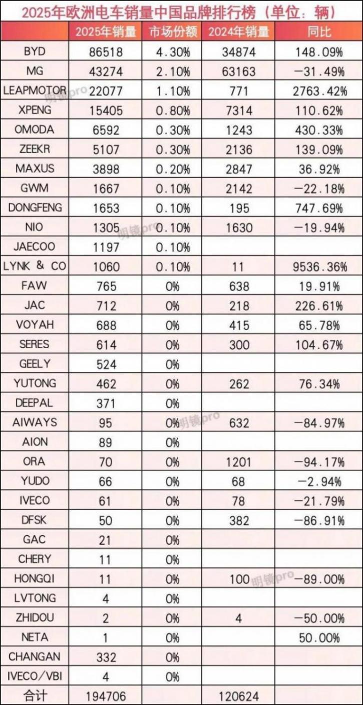 與此同時(shí),中國品牌在歐洲電車銷量的位次也發(fā)生了變化。其中,比亞迪首次超過MG,斷層拿下了第一的位置;零跑則反超小鵬、大通等一眾品牌,躋身第三,是2025年中國品牌電車出口歐洲的最大黑馬。